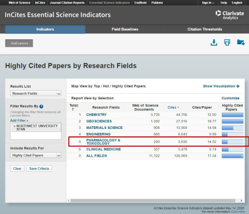 5月14日晚,基本科学指标数据库更新2020年5月最新数据,我校药理学与毒理学学科首次进入基本科学指标全球前1%。至此,永利集团入选基本科学指标全球前1%学科数增至6个,包括地球科学、材料科学、化学、工程学、临床医学、药理学与毒理学,圆满完成学校“十三五”学科发展目标。其中,生命科学与医学部继2019年9月临床医学进入基本科学指标全球前1%后,再有药理学与毒理学新增进入,标志着学部的学科声誉及学术影响力进一步彰显,我校生命科学和医学领域的国际影响力和全球竞争力快速提升。