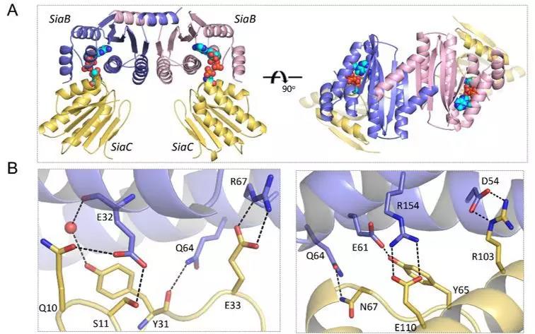图2. SiaB-SiaC-ADP复合物晶体结构。(A)SiaC-SiaB-ADP复合物三给晶体结构;(B)SiaB-SiaC相互作用表面。