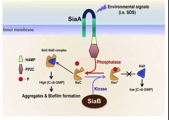 图3. 铜绿假单胞菌SiaABCD信号系统调控生物被膜及细菌聚集分子机制。一般条件下(如丰富培养基),激酶SiaB发挥主要作用,催化SiaC磷酸化,阻止SiaC与SiaD结合进而激活其c-di-GMP合成酶活性。因此,低水平的胞内c-di-GMP不足以促进生物被膜及细菌聚集的形成。当细菌遭遇环境压力时(如SDS刺激),SiaA磷酸酶活性被激活,去磷酸化SiaC蛋白,促进SiaC-SiaD蛋白结合,激活SiaD合成酶活性。此时,高水平的胞内c-di-GMP激活生物被膜及细菌聚集形成。