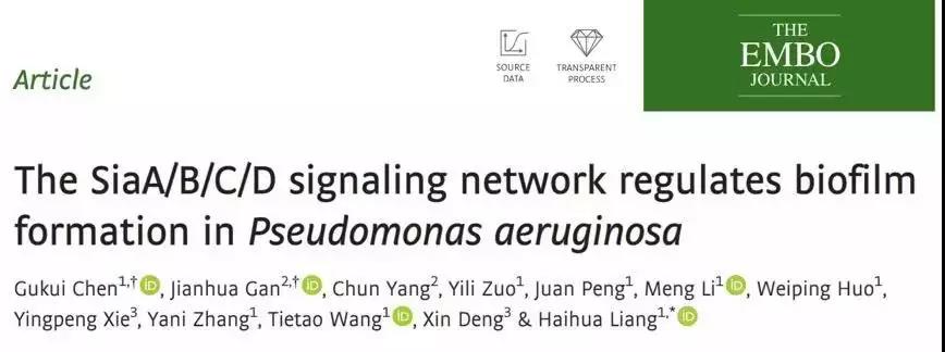 2020年2月24日,我院西部资源生物与现代生物技术教育部重点实验室梁海华教授团队在EMBO J上发文:The SiaA/B/C/D signaling network regulates biofilm formation in Pseudomonas aeruginosa,研究揭示了铜绿假单胞菌生物被膜形成的信号通路,及其调控过程。