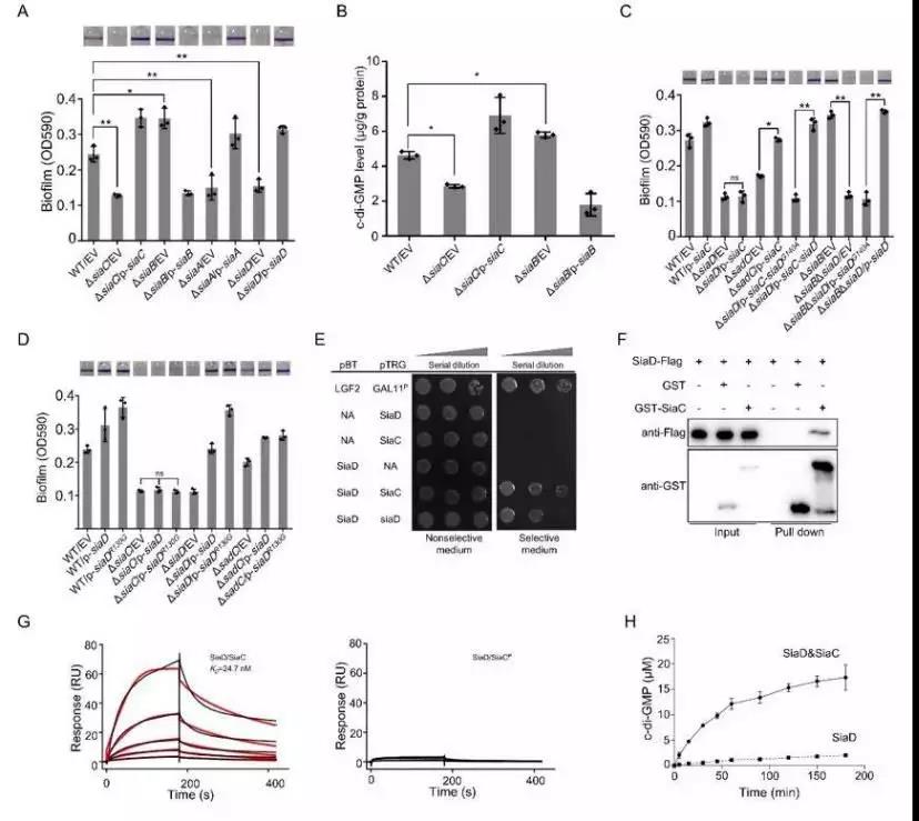图1. SiaC激活SiaD酶活性。(A-D),生物被膜型研究表明SiaD依赖于SiaC发挥功能。细菌双杂交(E)、GSTpull down(E)以及SPR(E)分析表明SiaC与SiaD蛋白直接结合。(H)体外酶活实验表明SiaC通过与SiaD结合,激活SiaD合成酶活性。