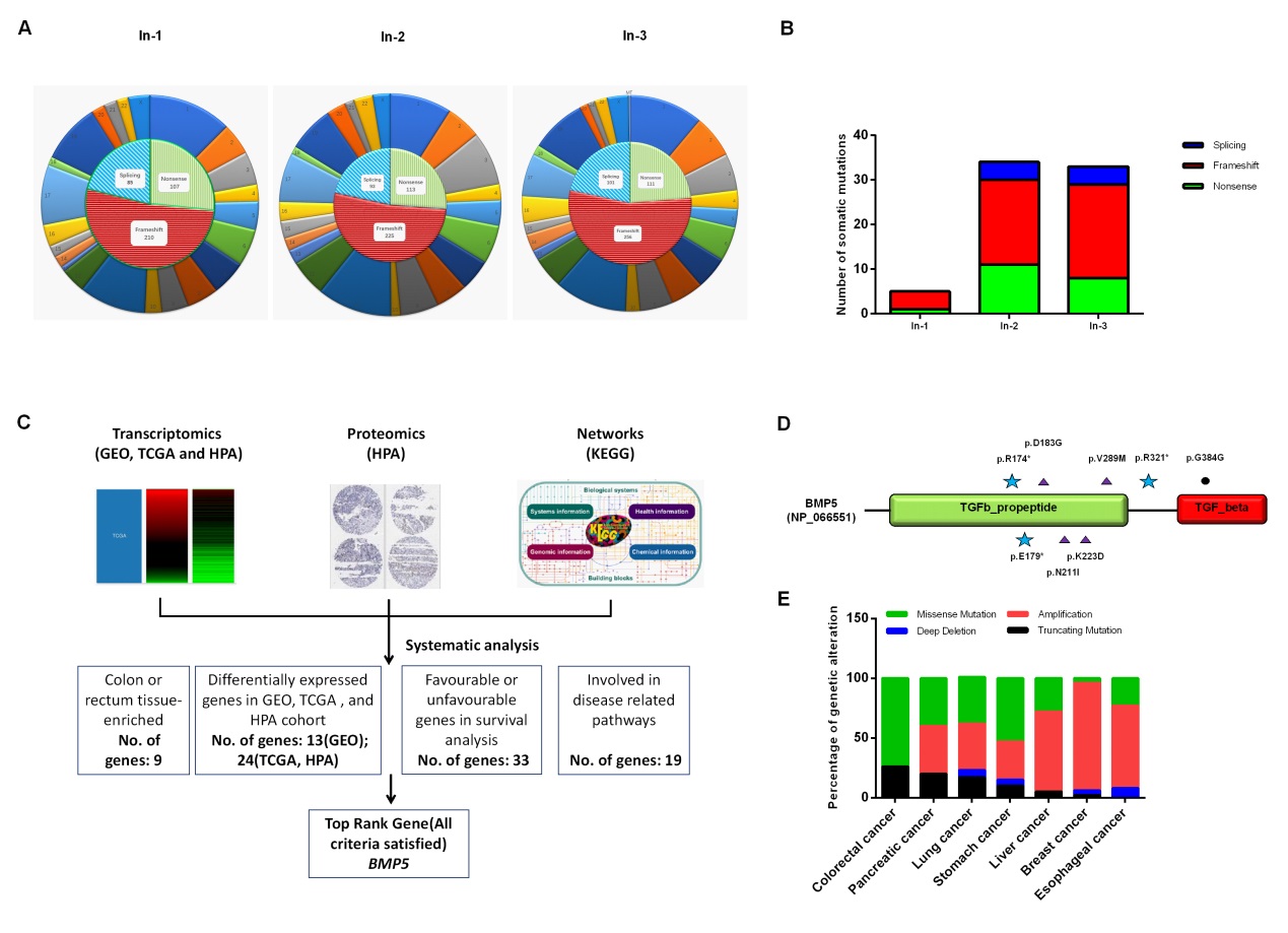 课题通过外显子组测序及大样本深测序确定sCRC新的组织特异突变,结合多组学系统筛选新的候选基因BMP5。通过五种消化道肿瘤(结直肠癌,胃癌,食管癌,胰腺癌,肝癌)以及两种高发肿瘤肺癌和乳腺癌中BMP5表达和变异类型的比较,研究发现BMP5的表达缺失及其预后价值是sCRC特有的,且BMP5的变异形式在sCRC中与其它肿瘤不同;体内外功能实验证实BMP5在CRC模型中具有抑癌作用;更为重要的是,BMP5的表达缺失作为结直肠腺瘤发生的早期事件,其表达可抑制由IL-28A(Interferon Lambda 2)介导的EPSTI1(上皮-基质相互作用蛋白1)基因激活。EPSTI1作为原癌基因在肿瘤初始中发挥重要作用,该结果进一步证实BMP5在sCRC早期发生中的