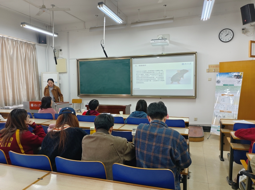 生物化学与分子生物学探索专场于7403教室举行,共有59名同学进行了汇报展示,由谢鑫、李俊、余君萍3位老师担任评委。