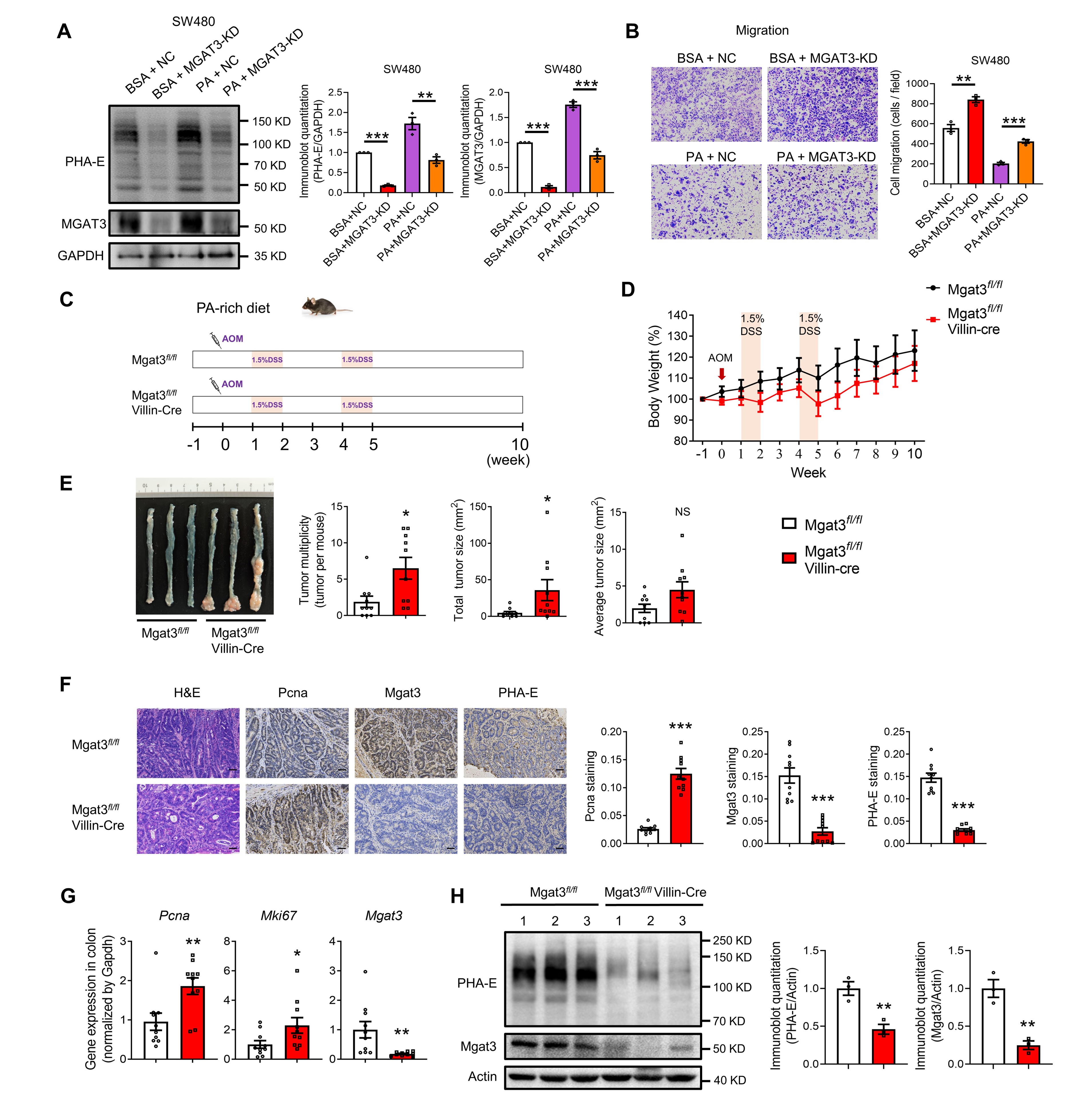 本研究发现,CRC患者结肠组织中平分型GlcNAc及MGAT3水平均显著降低。在CRC细胞中,下调平分型GlcNAc可促进细胞增殖、迁移和侵袭,同时抑制细胞凋亡。此外,在偶氮甲烷/右旋糖酐硫酸钠(AOM/DSS)诱导的CRC小鼠模型中,富含PA的饮食通过提高平分型GlcNAc水平显著抑制肿瘤发生;而在肠上皮特异性敲除Mgat3的小鼠中,这种抑制作用则完全消失(图1)。