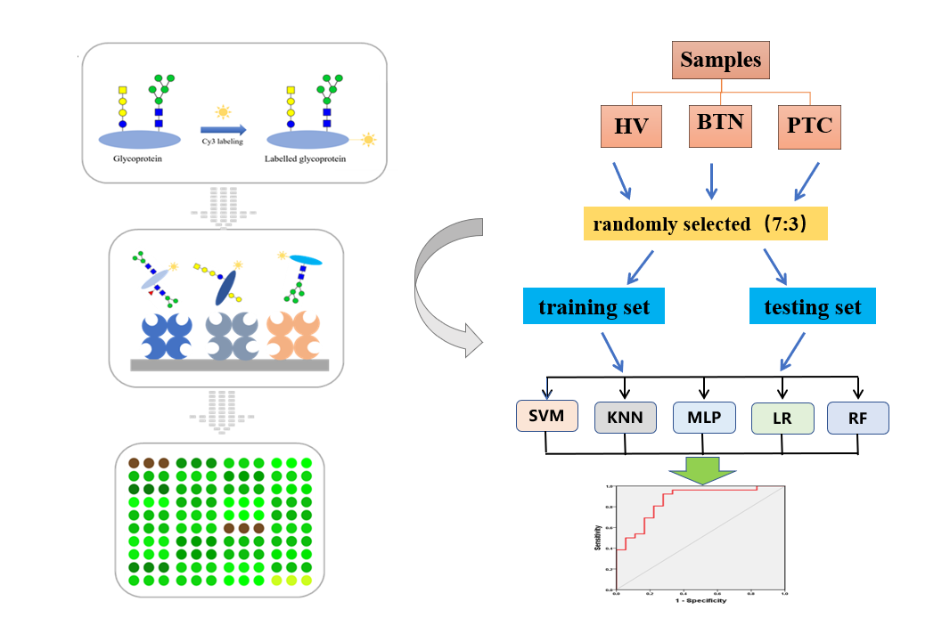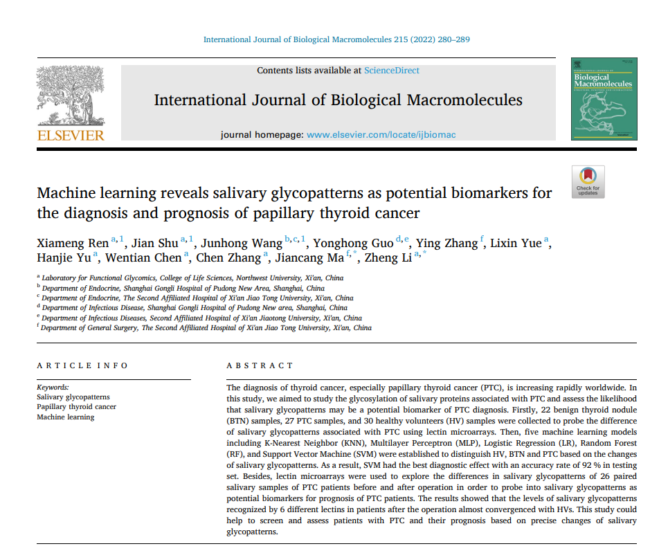 甲状腺癌是近20年来发病率增长最快的实体恶性肿瘤,以平均每年6.2%的水平增加,是女性恶性肿瘤中第五大常见癌症。新发病例中80%为甲状腺乳头状癌(Papillary thyroid cancer,PTC)。目前临床所用的检查方法存在假阳性、假阴性、辐射暴露以及过度诊断等缺点。已有研究表明,肿瘤发生及发展通常伴随着糖基化的改变。yl9193永利集团功能糖组学实验室李铮教授团队利用凝集素芯片技术研究了PTC患者术前术后、甲状腺良性结节患者(Benign thyroid nodule,BTN)以及健康志愿者(Healthy volunteer,HV)的唾液糖蛋白糖型。基于唾液糖蛋白糖型数据,运用多种机器学习算法构建PTC诊断模型,评估并探讨唾液糖蛋白糖型作为 PTC 患者诊断及预后标志物的意义。相关研究结果于近日发表于International Journal of Biological Macromolecules,我校为第一署名单位和通讯单位。