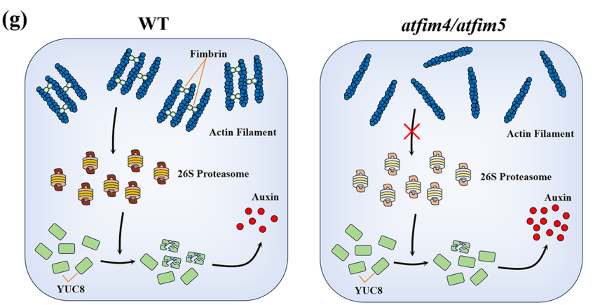 丝束蛋白Fimbrin是一类在真核生物中高度保守的微丝成束/交联蛋白。拟南芥中该家族成员AtFIM4和AtFIM5缺失后,根系中生长素的水平显著升高,进一步解析显示生长素合成途径中的关键限速酶YUC8蛋白的含量在atfim4/atfim5突变体中显著上升。