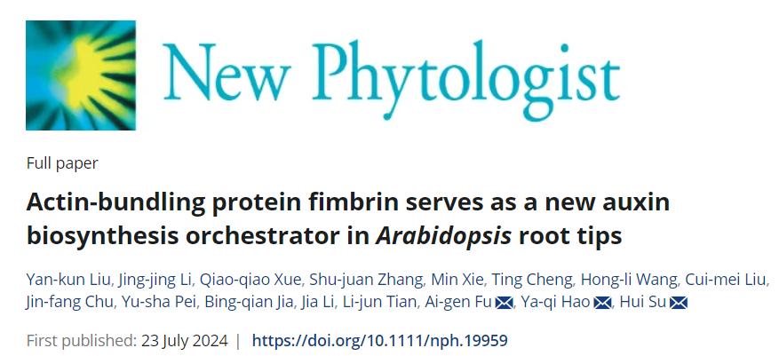 yl9193永利集团、西部资源生物与现代生物技术教育部重点实验室苏慧课题组近日在New Phytologist上发表了题为Actin-bundling protein fimbrin serves as a new auxin biosynthesis orchestrator in Arabidopsis root tips (doi: 10.1111/nph.19959) 的研究论文,揭示了丝束蛋白Fimbrin家族成员AtFIM4和AtFIM5通过控制生长素的生物合成来调节根系内源性生长素水平,从而参与植物根系的生长发育。该研究首次揭示了植物细胞骨架在控制生长素生物合成中的作用。