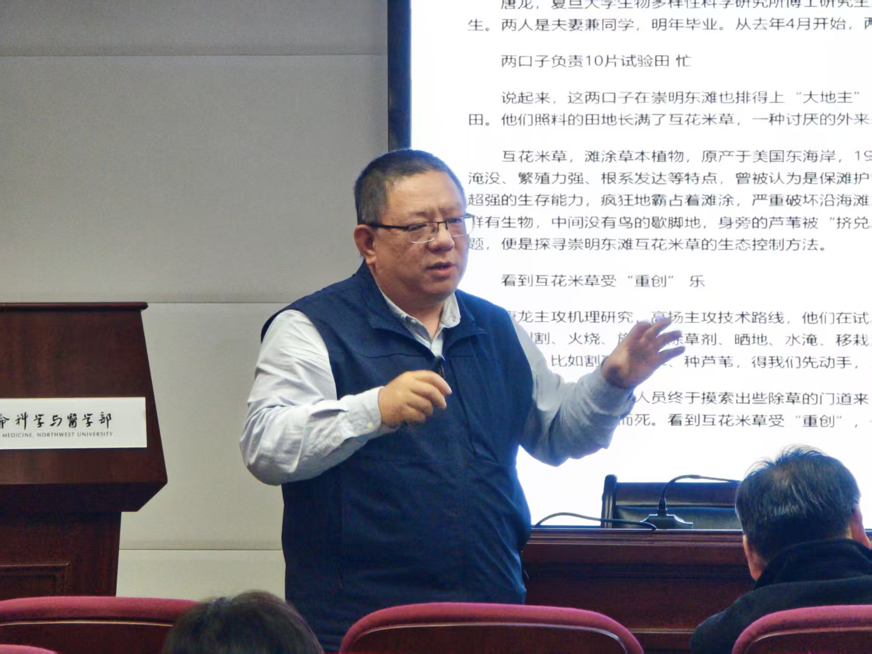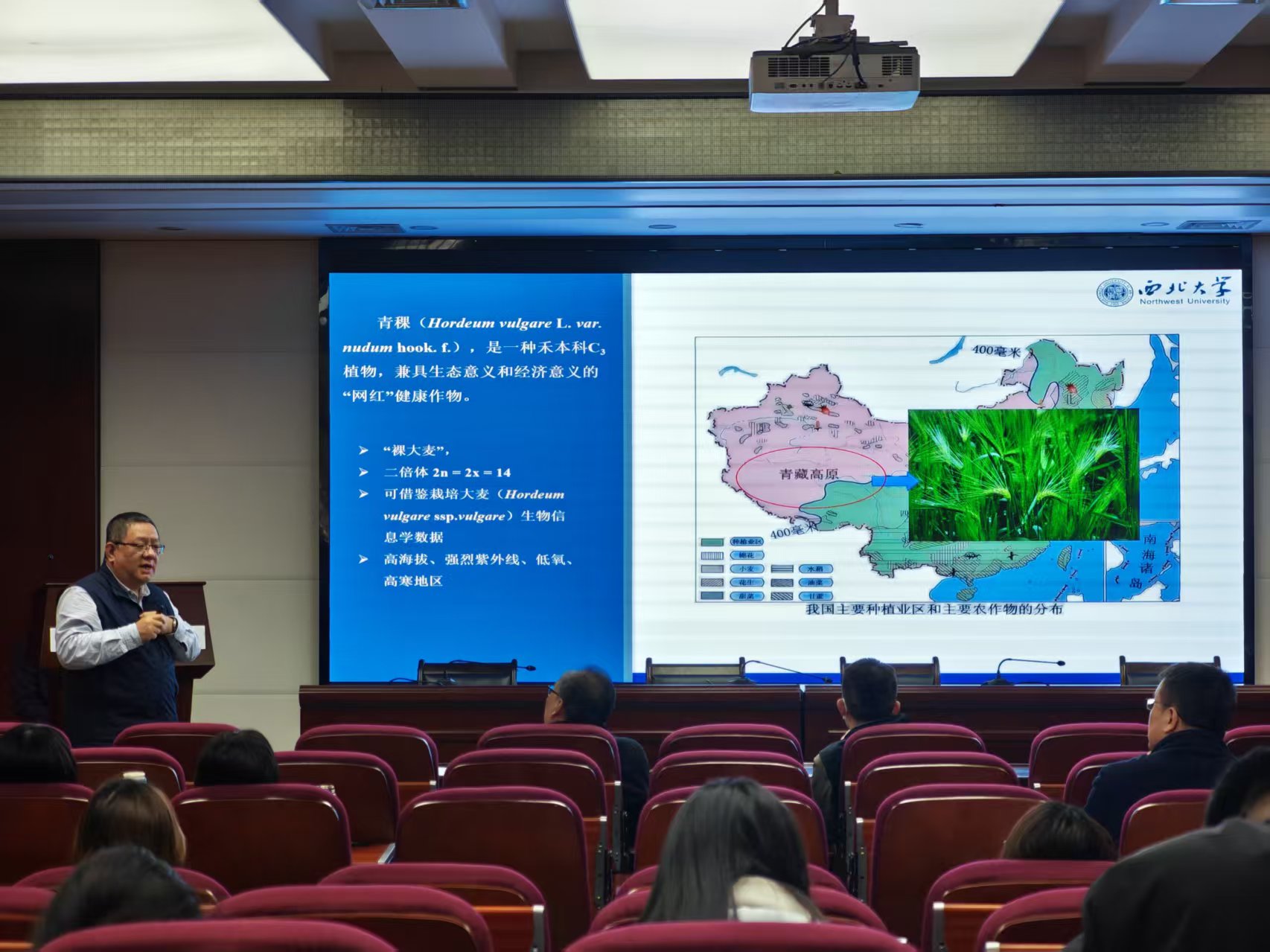 随后,赵宇玮老师系统介绍了团队多年来在相关领域的研究进展:从早期开展小麦细胞工程研究,到围绕青稞抗逆机制的连续探索,课题组发现外源褪黑素在低温条件下能够调节青稞生物钟节律,从而影响氧化还原稳态并提升抗逆能力;在互花米草研究方面,课题组结合转录组测序与实验室竞争体系构建,尝试挖掘复合胁迫响应的关键功能基因,初步揭示了部分关键基因在植物耐盐性与生物竞争适应过程中的潜在调控作用。同时,针对互花米草等非模式植物基因功能验证体系相对欠缺、竞争体系构建复杂等研究挑战,课题组分享了利用模式植物替代验证、结合高通量组学数据进行候选基因筛选与功能推断等方法的探索实践。此外,赵宇玮老师还介绍了课题组未来的研究规划。借助学院近期新增的关键实验设备,课题组将进一步聚焦生物钟与光合作用系统之间的功能关联,力图构建更为完整的禾本科植物复合抗逆调控网络,为作物抗逆改良和生态适应性提升提供理论基础与技术储备。