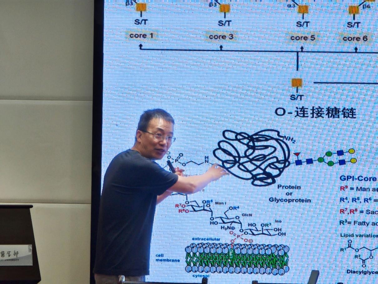 关锋老师首先以“细胞中的糖”为切入点,系统阐释了糖在生命活动中的核心功能:不仅是能量供给与结构骨架的基础,更在分子识别与调控中发挥关键作用,对于解读生命复杂性至关重要。他以细胞表面糖萼结构为基础,直观展示了糖蛋白、糖脂在细胞膜上的分布,阐明了糖萼为细胞膜提供缓冲、抵御病原体入侵、抑制细胞侵袭的核心生物学功能。