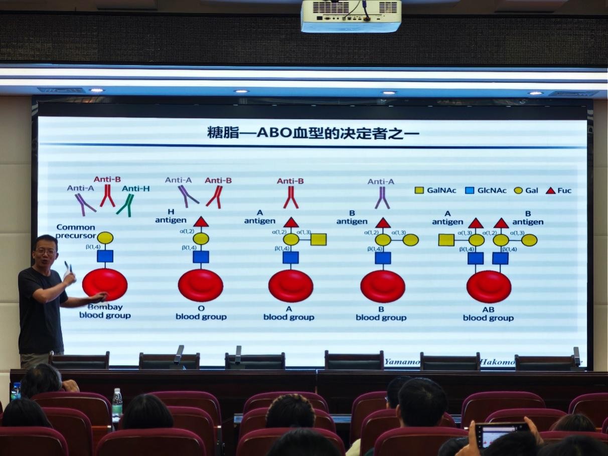 随后,关锋老师围绕糖生物学的基础机制与经典研究展开深度讲解。他以ABO血型系统为经典案例,从糖脂结构、ABO基因结构到分子遗传机制,完整呈现了糖链作为血型决定簇的科学原理,并追溯了该领域的经典研究历程;同时系统梳理了糖鞘脂的合成通路与疾病关联,点明糖链异常修饰在神经退行性疾病、肿瘤发生中的关键作用,并重点分享了团队在肿瘤糖修饰与免疫治疗、细胞外囊泡糖生物学研究、疾病治疗以及医药研发等方面的前沿研究成果:揭示了肿瘤细胞唾液酸修饰、MGAT5介导的糖基化对CAR-T细胞杀伤的抑制机制,提出“摘去肿瘤细胞糖衣”的免疫治疗新策略,为肿瘤免疫治疗提供了全新靶点;同时介绍了Anti-GD2抗体在神经母细胞瘤治疗中的开发进展,展示了糖靶向药物的临床应用潜力。明确了糖抗原在肿瘤诊断、疫苗开发中的核心价值,展望了糖科学在生物医药领域的广阔应用前景。