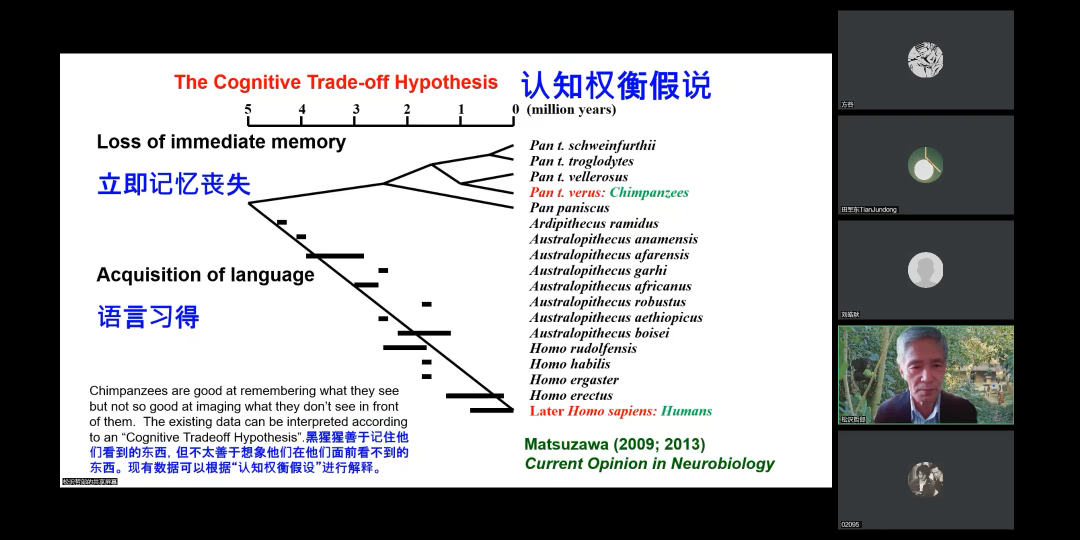 讲座中,Tetsuro Matsuzawa教授介绍了关于黑猩猩认知研究的最新进展,包括非洲黑猩猩在野外学习和使用工具的能力。随后Tetsuro Matsuzawa教授介绍了研究黑猩猩的认知能力对研究人类大脑工作机制的重要意义。Tetsuro Matsuzawa教授通过短片展示了黑猩猩惊人的认知和学习能力,在实验室内,工作人员通过让黑猩猩触摸屏幕来研究黑猩猩的学习水平和记忆能力,展示了黑猩猩在即时记忆中的优势。Tetsuro Matsuzawa教授提出认知权衡假设,认为人类通过丧失强大即时记忆的能力,来进化出语言与想象的功能。
