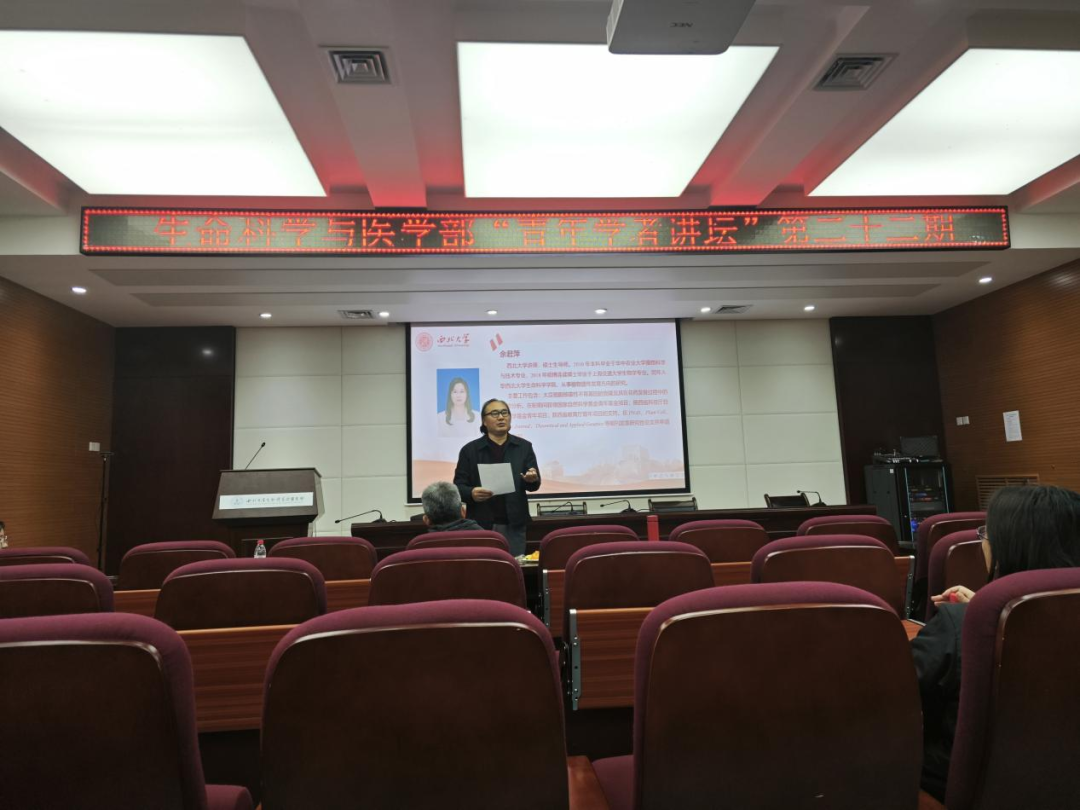 11月23日中午,生命科学与医学部第二十二期“青年学者讲坛”于博望报告厅举行,邀请余君萍老师作为主讲嘉宾进行学术分享,五十多名学部师生参加,报告由付爱根教授主持。