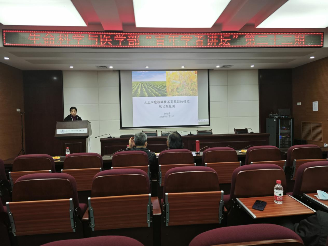 余君萍老师指出,花药是内轮器官,每个花药由四个花粉囊腔构成。花药切片显示每个花粉囊腔由两类细胞组成:一类是花药壁细胞,另一类是性母细胞(随后发育成小孢子、花粉粒)。花药根据发育的时间先后顺序可以分成14个时期,其中7-8时期是减数分裂时期,9-12时期绒毡层会降解和花粉粒形成。绒毡层在花药发育过程中其中重要作用,减数分裂时期绒毡层形成胼胝质合成酶;减数分裂结束分泌胼胝质酶降解胼胝质。绒毡层降解可以为小孢子外壁发育提供营养物质,绒毡层异常降解将导致雄性不育。最后,余君萍老师分享了大豆细胞核雄性不育的科研进展。