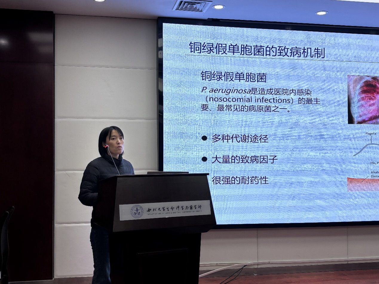 孔伟娜老师首先介绍了铜绿假单胞菌的致病机制及特点,它是造成医院内感染的最主要、最常见的病原菌之一,它有多种代谢途径,含有大量的致病因子,具有很强的耐药性。分享主要围绕c-di-GMP(环二鸟苷酸)这一细胞内的新型第二信使分子展开,分析了细胞中低浓度与高浓度的c-di-GMP在调控急慢性感染转换过程中不同的效果,低浓度的c-di-GMP有利于细菌的运动性和毒性因子的产生,高浓度的c-di-GMP可促进细菌胞外多糖的分泌以及生物被膜的形成。