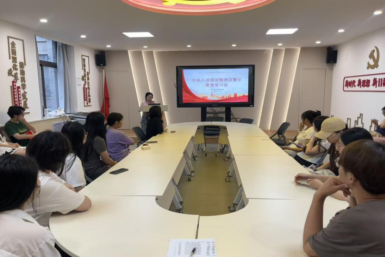会上,集体学习了《党的十八大以来深入贯彻中央八项规定精神的成效和经验》,传达了省委党的建设工作领导小组会议和全省深入贯彻中央八项规定精神学习教育工作推进会学习教育有关要求,深刻领会党中央推进全面从严治党、深化作风建设的坚定决心与战略部署,进一步明确了新时代党员在作风建设中的责任与使命。随后,警示教育环节通报了湖北省黄冈市黄梅县、安徽省安庆市宿松县千岭乡党员干部在学习教育期间违规吃喝的典型案例。这些案例以鲜活的事实、惨痛的教训,为师生党员敲响了警钟。交流研讨中,各党支部代表结合学习工作实际,深入剖析案例,一致认为要以反面典型为镜鉴,拧紧思想“总开关”,严守纪律规矩底线,推动中央八项规定精神入脑入心、见行见效,共同营造风清气正的政治生态。