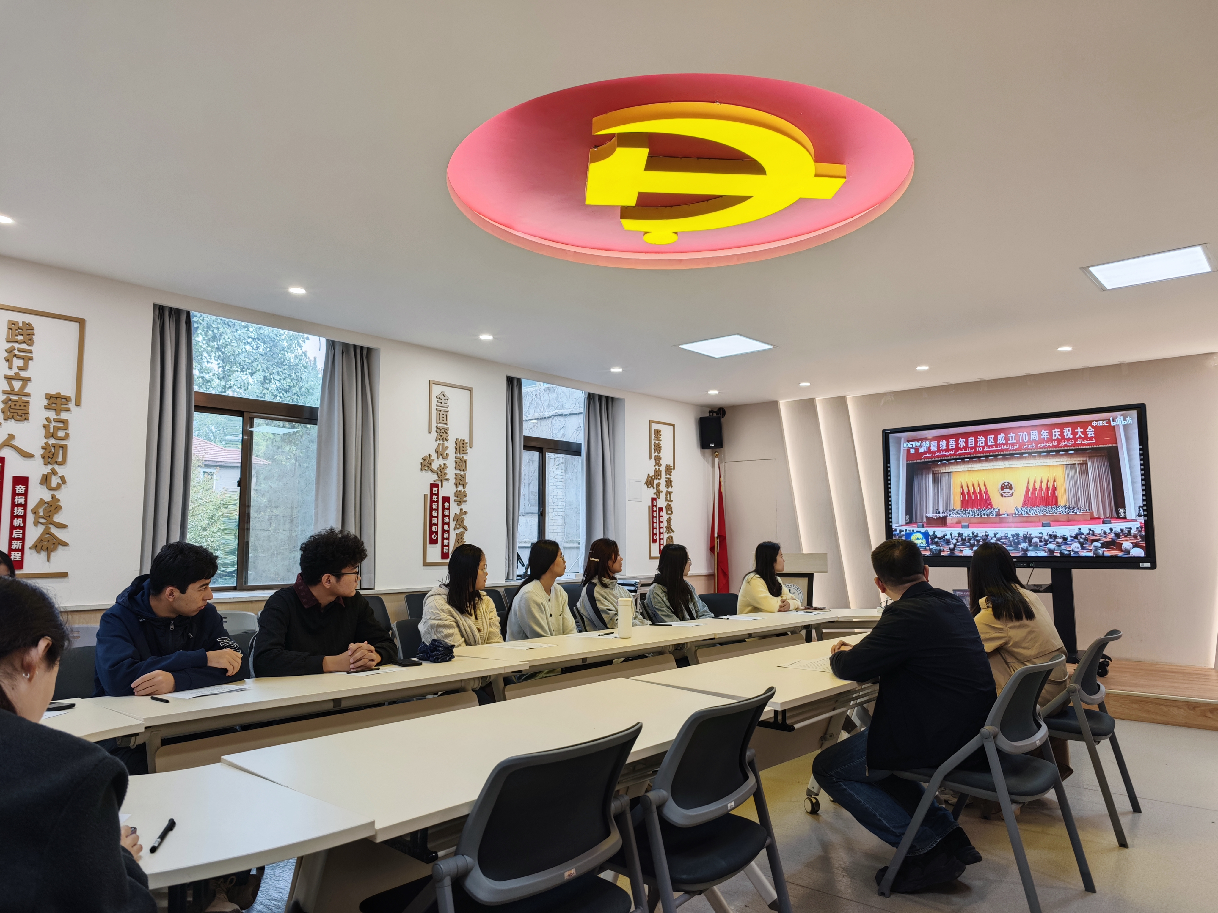 会议伊始,全体与会人员共同观看了2025年9月25日举行的新疆维吾尔自治区成立70周年庆祝大会实况。中共中央总书记、国家主席、中央军委主席习近平出席大会,王沪宁代表中央代表团发表讲话,指出新疆维吾尔自治区成立70年来,在党的领导下,各族人民共同团结奋斗,取得了社会主义革命、建设与改革开放的伟大成就,新时代党的治疆方略深入人心,新疆各民族大团结局面持续巩固,中华民族共同体意识日益增强。观看过程中,师生深受鼓舞,对“各民族像石榴籽一样紧紧抱在一起”的生动实践有了更加直观而深刻的感悟。