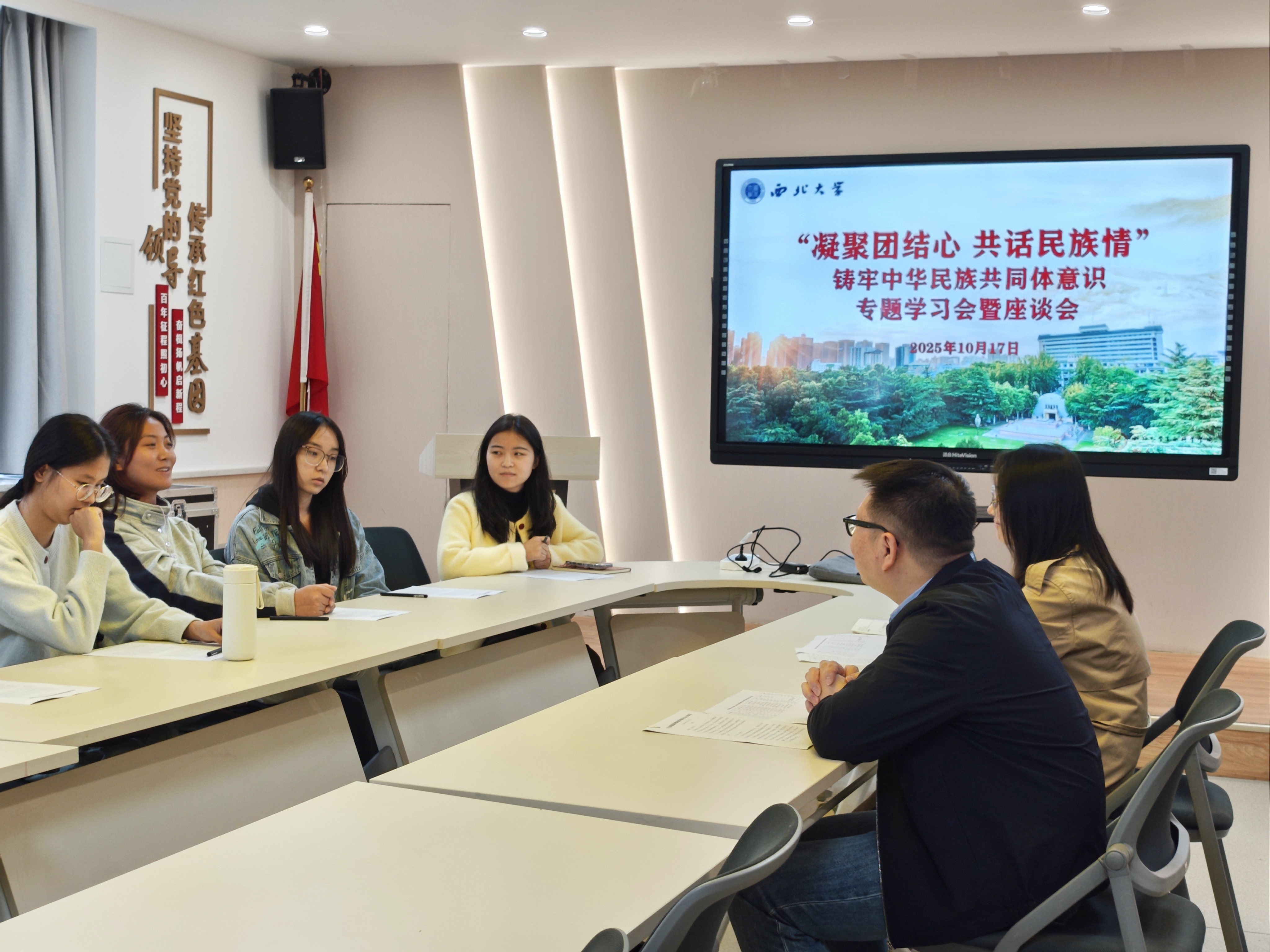 党的十八大以来,我们党鲜明提出把铸牢中华民族共同体意识作为新时代党的民族工作的主线、作为民族地区各项工作的主线。为深入学习贯彻习近平总书记关于加强和改进民族工作的重要思想和中央民族工作会议精神,进一步强化各族学生铸牢中华民族共同体意识思想入脑入心,深入了解各族学生学习、生活、思想动态,2025年10月17日中午,学院于博雅会议室组织召开“凝聚团结心 共话民族情”铸牢中华民族共同体意识专题学习会暨座谈会。党委副书记陈露出席,各族学生代表共同参与。活动由辅导员郭佳惠主持。