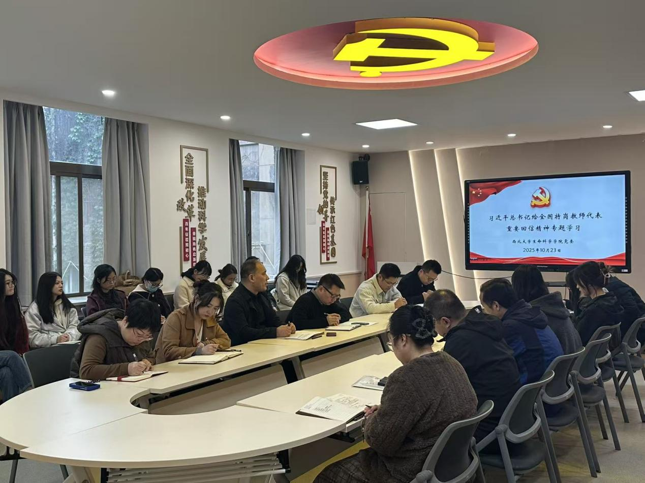 会上,刘小光书记带领全体党员认真学习了习近平总书记回信的主要内容。习近平总书记在回信中,代表党中央向全国特岗教师和教育工作者致以节日问候,充分肯定了教师在国家发展、民族振兴中的重要贡献。他勉励特岗教师牢记为党育人、为国育才的初心使命,自觉践行“学为人师、行为世范”,以德立身、以德立学、以德施教,做学生为学、为事、为人的“大先生”,为强国建设、民族复兴伟业作出新的更大贡献。在交流研讨环节,各党支部代表结合教学科研实际,畅谈学习体会。与会人员纷纷表示,要将总书记的殷切嘱托转化为前进动力,在教育教学与科研创新中践行育人初心。刘小光书记在总结讲话中指出,总书记的回信饱含深情、意义深远,为新时代教师队伍建设指明了方向。全院教师要把回信精神转化为教书育人的思想自觉和行动指南,坚定理想信念,厚植教育情怀,坚守师德师风,潜心立德树人。