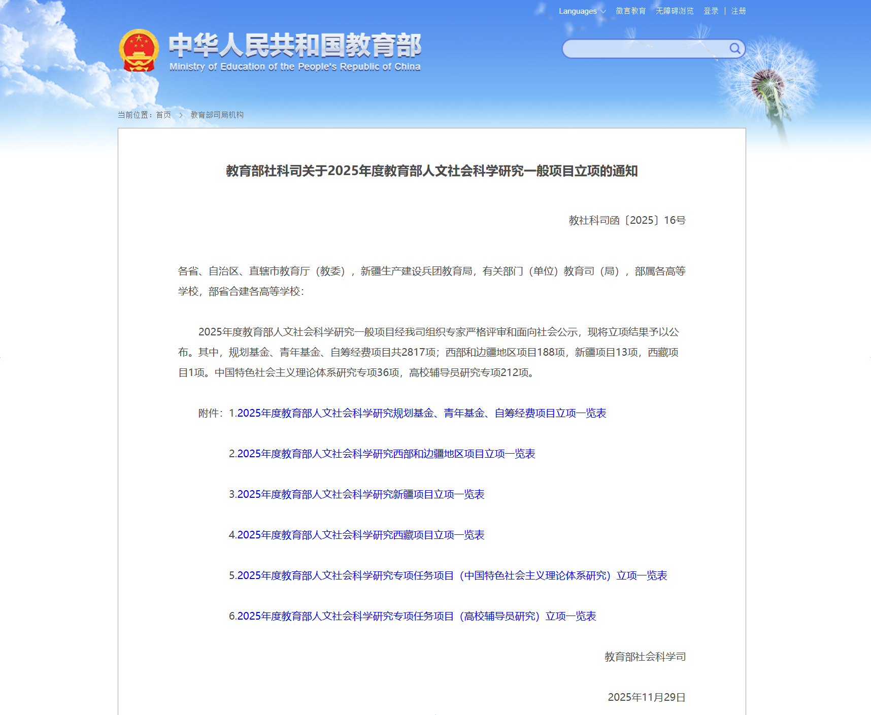 近日,教育部社会科学司公布了2025年度教育部人文社会科学研究一般项目立项名单,我院辅导员常雅慧主持的《“三维素养・三阶赋能”高校组织员队伍建设模式研究——基于“一融双高”视域》获批高校辅导员研究专项。