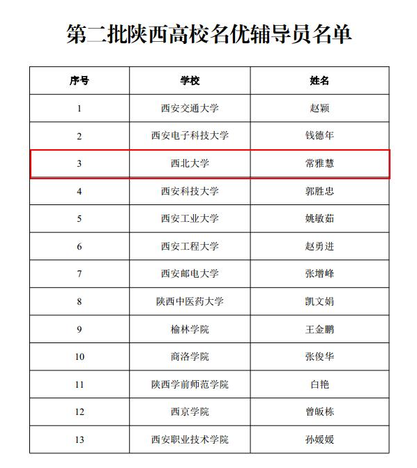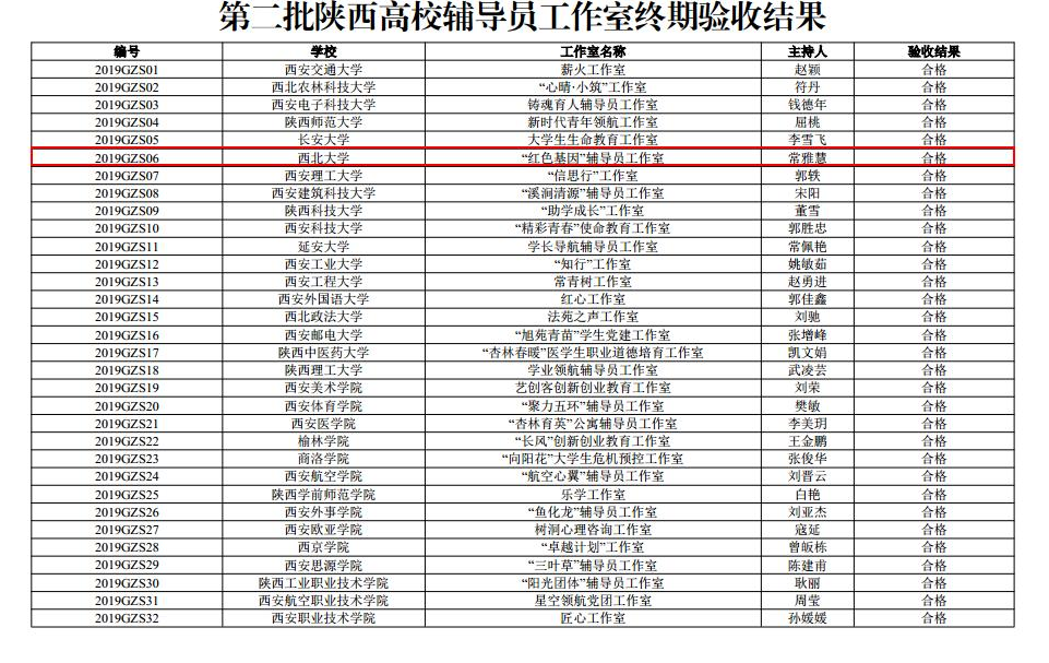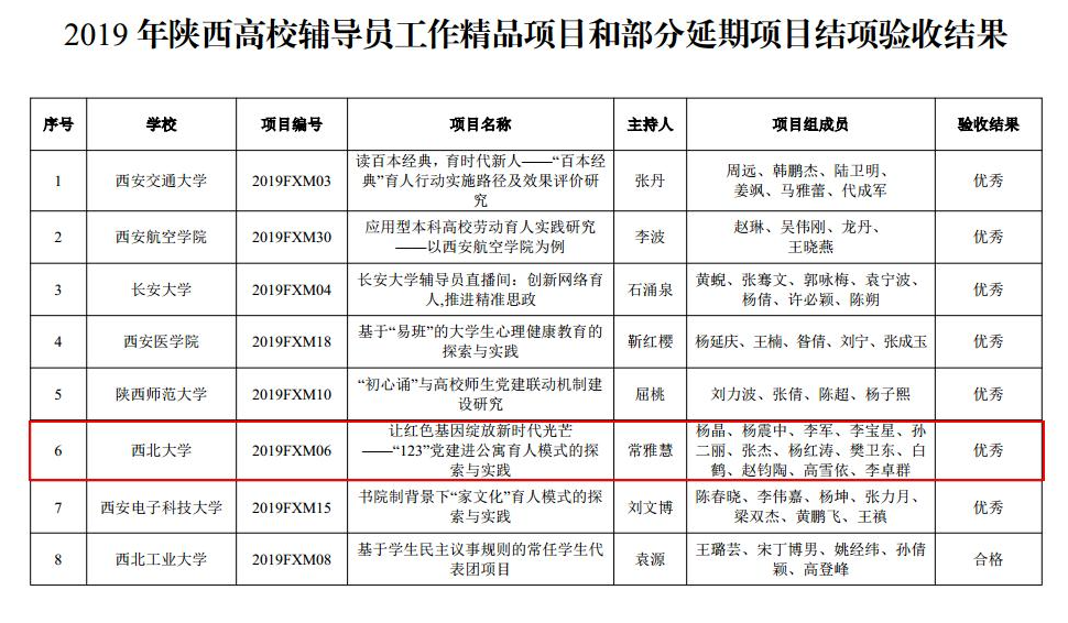 近日,省委教育工委下发《中共陕西省委教育工委关于公布第二批陕西高校辅导员工作室终期验收结果和2019 年陕西高校辅导员工作精品项目结项验收结果的通知》,我院“红色基因”辅导员工作室顺利通过验收,被授予“陕西高校省级辅导员示范工作室”,常雅慧荣获“陕西高校名优辅导员”称号,精品项目《让红色基因绽放新时代光芒——“123”党建进公寓育人模式的探索与实践》被评为优秀验收成果。