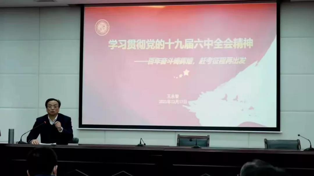 12月17日下午,生命科学与医学部在博望报告厅举行学习党的十九届六中全会精神报告会,我校马克思主义学院教授、博士生导师王永智应邀作了题为《学习贯彻党的十九届六中全会精神——百年奋斗铸辉煌,赶考征程再出发》的专题报告。学部全体党政班子成员、各党支部书记、党员代表、青马班学员共90余人聆听了报告。报告会由yl9193永利集团党委副书记魏宁主持。