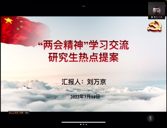 会上,全体人员集中学习了习近平总书记在2022年全国“两会”重要讲话精神和政府工作报告,学院党委组织员常雅慧在领学中强调,今年全国两会是在中国共产党成立100周年、党的十九届六中全会之后,党的二十大召开之前这一特殊时间节点举行的一次重要会议,习近平总书记提出5个“必由之路”、5个“战略性的有利条件”,宣示5个“我们就一定能够”,为全国人民奋进新征程、建功新时代坚定了信心,指明了方向,全体学生党员要心怀“国之大者”,与国家发展同向同行,为祖国建设贡献青春力量。随后,王勐、闫文波、吴国超等9位学生党员代表,围绕社会保障、教育改革、乡村振兴、生态文明、科技创新等话题,汇报了“两会”热点提案、政策解读和个人学习感悟。