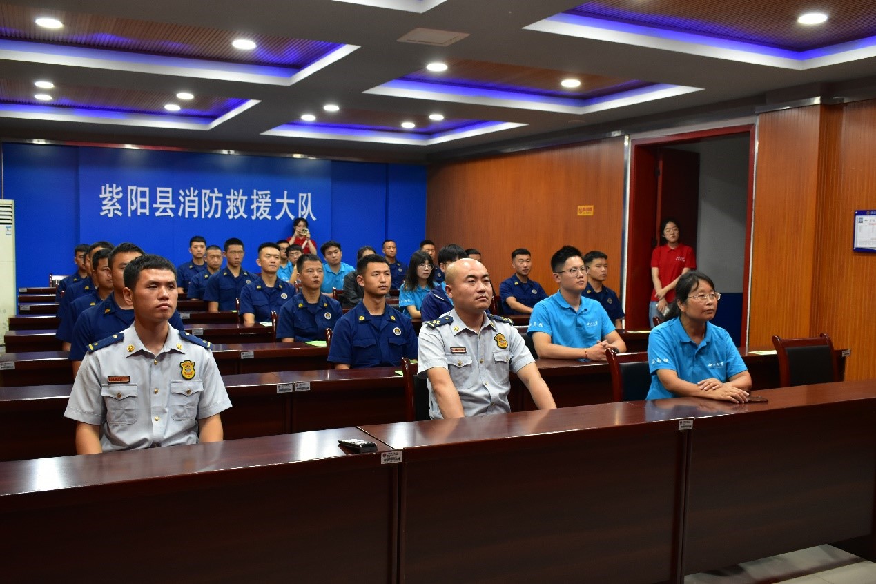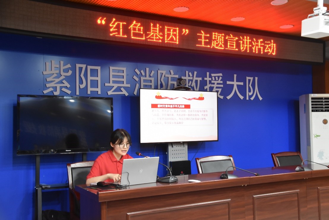 7月28日上午,“红色基因”党员宣讲团的成员何静、陈敏瑜、巨文萱跟随谭江丽教授、范铭沁老师所带领的暑期“三下乡”冲锋队到达了紫阳县消防救援大队,为消防员和工作人员开展宣讲活动。“红色基因”党员宣讲团用鲜活易懂的语言,多角度、多层次对党的二十大精神进行解读阐释、宣传宣讲,进一步推动党的二十大精神入耳入脑入心,让基层群众深入地了解革命历史,感受到革命先辈为了人民解放、幸福做出的巨大牺牲,赢得了在场消防员的共鸣。