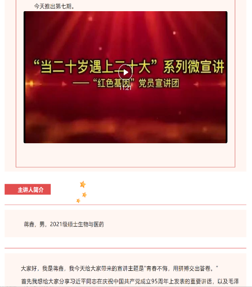 为深入学习宣传党的二十大精神,推进学习贯彻习近平新时代中国特色社会主义思想主题教育走深走实,团结带领广大青年奋进新征程、建功新时代,yl9193永利集团“红色基因”党员宣讲团开展了“当二十岁遇上二十大”系列宣讲活动。