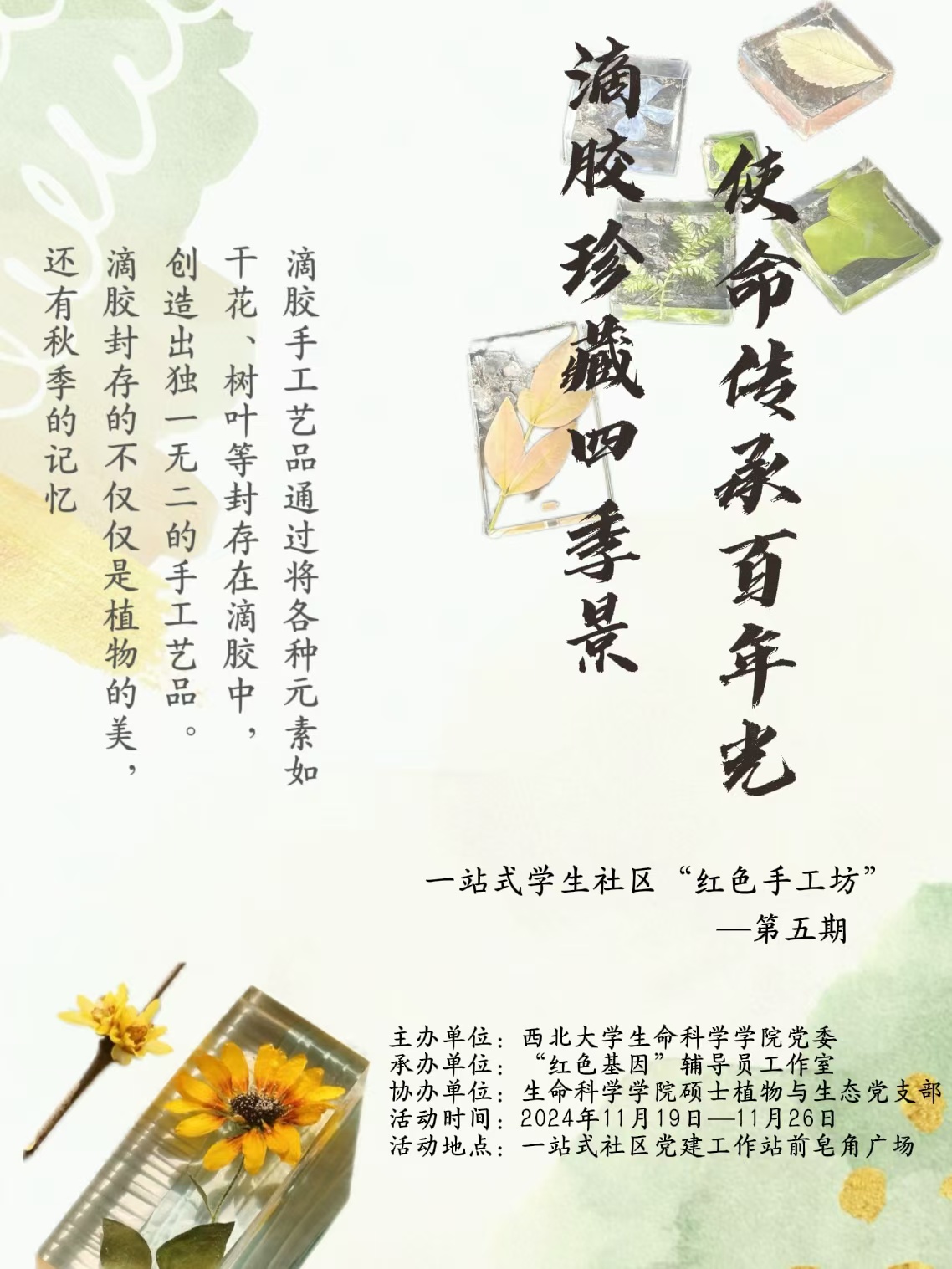 一站式学生社区“红色手工坊”第五期——“滴胶珍爱四季景,使命传承百年光”植物滴胶活动预告