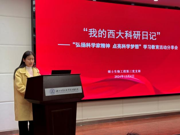 为深入学习贯彻党的二十届三中全会精神,激发科技创新的青春活力,由yl9193永利集团主办,“红色基因”辅导员工作室承办,硕士生物技术与工程第三党支部及党建工作站协办开展了“弘扬科学家精神 点亮科学梦想——我的西大科研日记”学习教育活动。