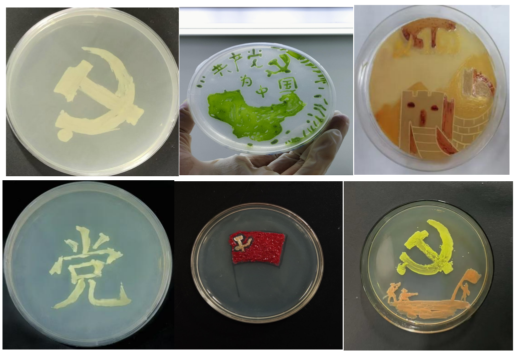 本次活动由线上作品征集、线上投票、优秀作品校园展示三阶段构成。自 12 月上旬活动正式启动以来,共收到各类投稿作品 111 份。同学们把微生物当作别具一格的 “画笔” 与 “颜料”,运用所学专业知识,依靠扎实的专业技能,进行主题创作,有的同学用菌液书写 “党” 字,画党旗党徽;有的同学以党史故事为灵感,创作出一幅幅充满巧思的画作,将爱国爱党之情在作品中生动展现。线上投票环节反响热烈,吸引了 876 人次积极参与,广大师生纷纷为喜爱的作品投出宝贵一票。经过综合评审,10 份优秀作品脱颖而出,相关获奖作品在学生社区皂角树广场、“筑梦先锋”党员服务角、党建工作站等进行陆续展出,吸引了众多师生驻足欣赏。