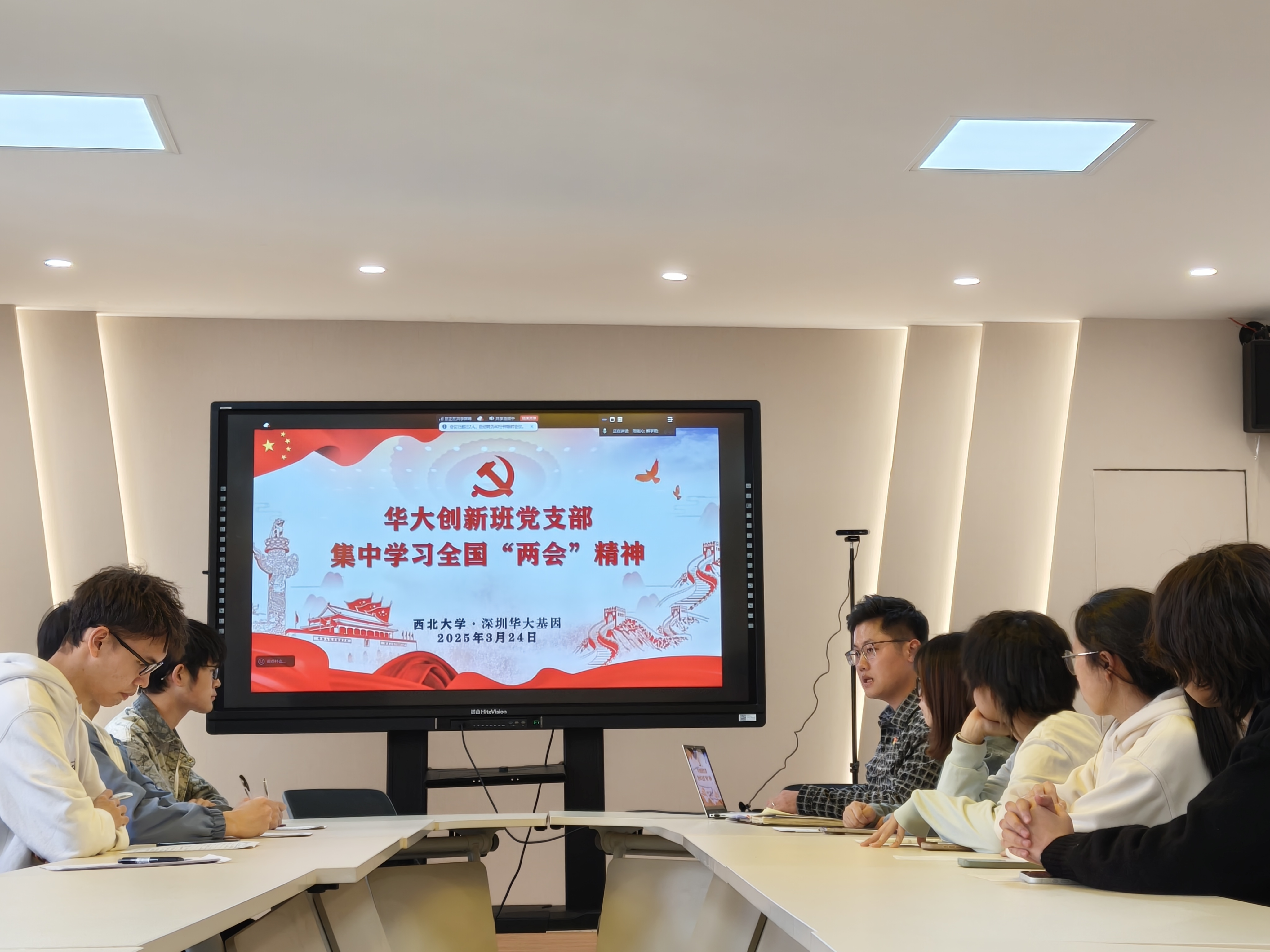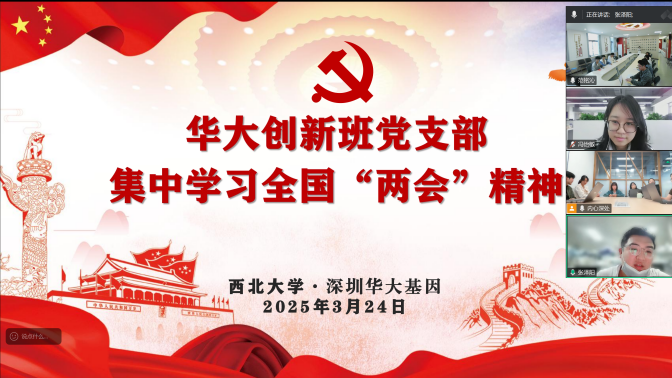 3月24日,华大创新班党支部以线上线下相结合的形式,组织开展全国“两会”精神专题学习会。会议由党支部书记范铭沁主持,支部全体党员及积极分子积极参与,通过政策领学、视频观看、心得分享等形式,深入学习领会“两会”精神,凝聚奋进力量。