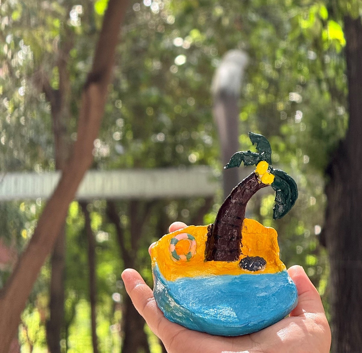黏土杯垫以层叠礁石撑起海岸脊梁,浪纹由深蓝向浅沙渐变,模拟潮汐呼吸的节奏。椰树剪影斜倚沙滩,与环形泳圈构成视觉支点——泳圈不再漂浮于海面,而是半掩于沙中,暗示人类遗留物对海洋的侵蚀。粗粝的手工肌理还原原始沙滩质感,刻意消减装饰性色彩,以大地色系传递纯净自然之美。当杯盏与这片海岸共鸣,每一道杯沿弧线都似无声承诺:守护蔚蓝,从拾回被遗忘在沙滩的“夏日玩具”开始。