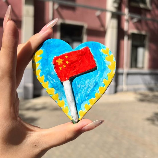 这一颗心,绘着鲜艳的五星红旗,似在风中舒展。旁边还有着黄澄澄的麦穗,由众多麦粒组成,紧密相连。可以说每一粒麦子,都代表我们每一个人。象征人们团结一心、相互协作,共同创造美好未来 。每一抹色彩都饱含热爱。是对祖国赤诚心意的寄托,那一抹红,是刻在心底的骄傲,是永不褪色的信仰。