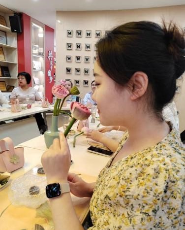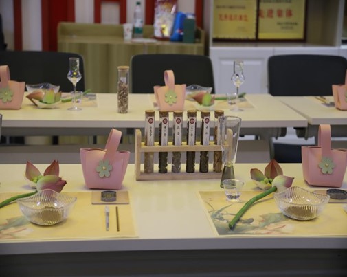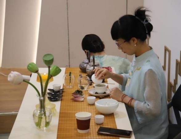 茶事体验区同样氛围热烈,专业茶艺师现场展示荷蕊熏制白茶的冲泡技艺,细致讲解了白茶的特性、荷蕊熏制工艺、折叠荷花造型以及夏日饮茶养生知识。教职工们轻啜茶汤、品尝莲子,在氤氲茶香和清新的莲香中深入感受传统茶文化的精妙,放松了身心。