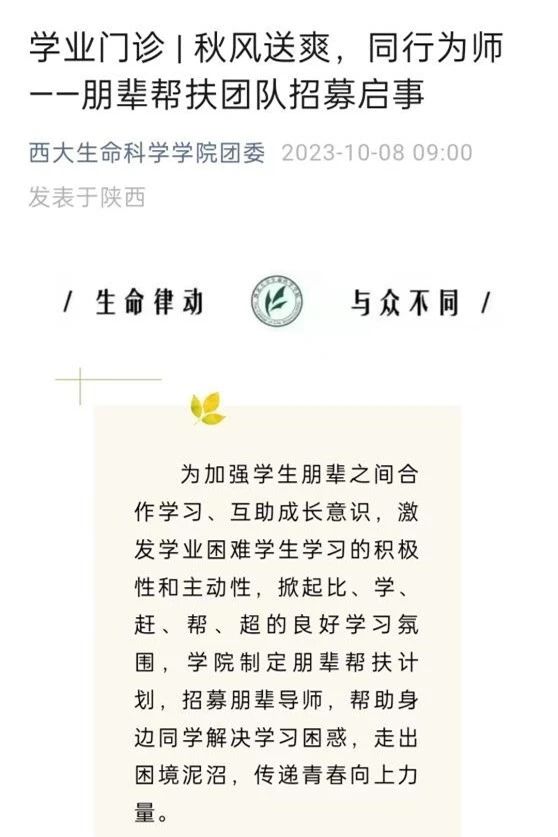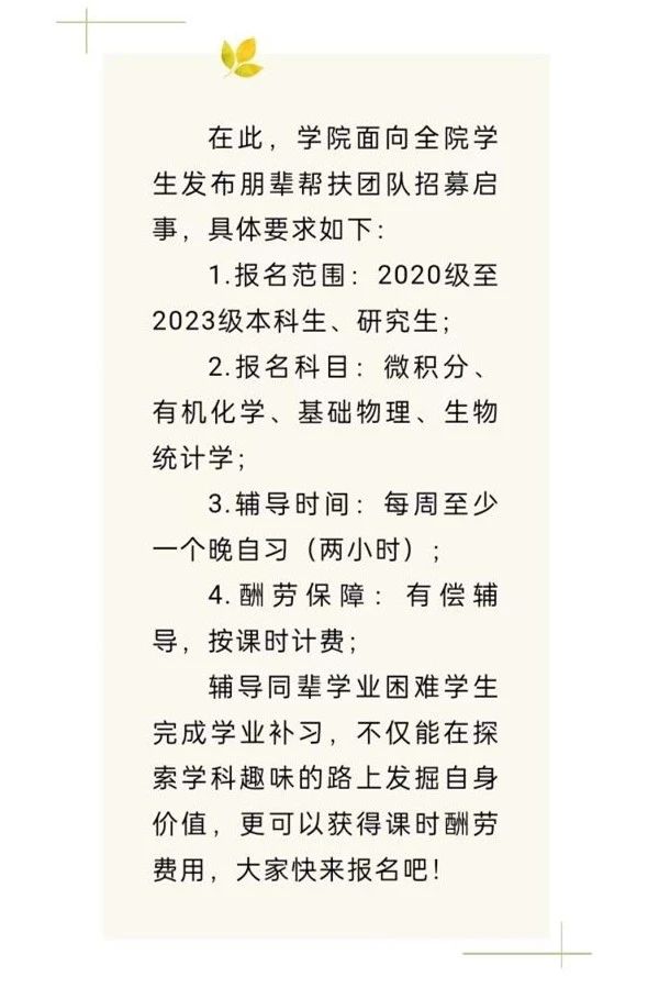 学院开展了朋辈帮扶计划,在公众号上发布朋辈帮扶团队招募信息,让朋辈导师发挥微积分、有机化学、计算机等科目特长,帮助挂科同学顺利通过重修。