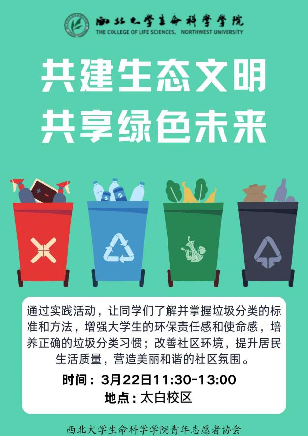 为弘扬雷锋精神,深化环保理念,我院青年志愿者协会于3月22日在太白校区开展了以“共建生态文明,共享绿色未来”为主题的垃圾分类宣传活动。此次活动旨在通过实际行动,提升同学们的垃圾分类意识,普及环保知识,共同守护绿色校园。
