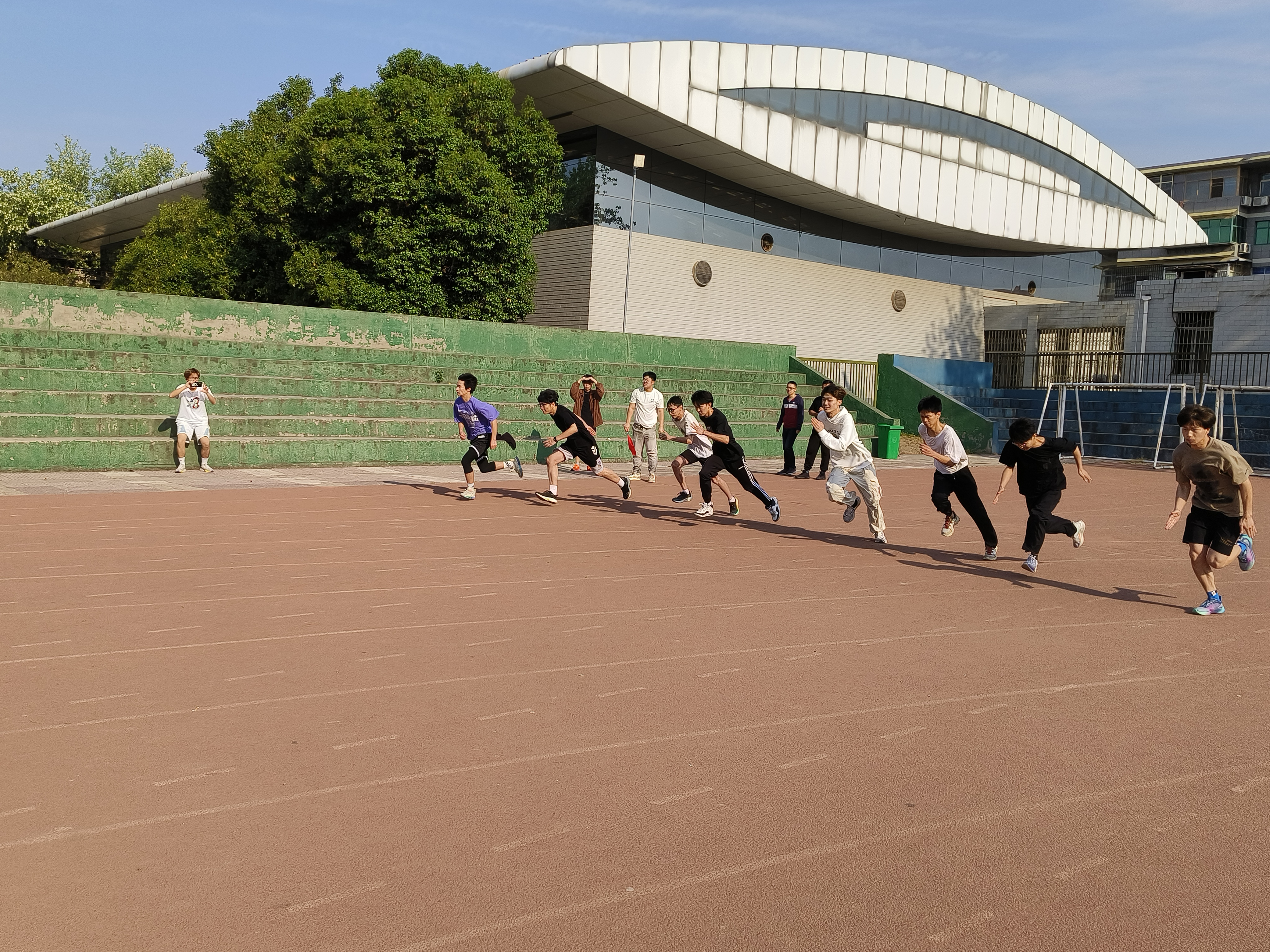 本次运动会的项目包括100m、400m、1500m、2000m、4×100m接力、混合接力、跳远和铅球。接下来,让我们一起看看运动健儿们的潇洒风姿吧。