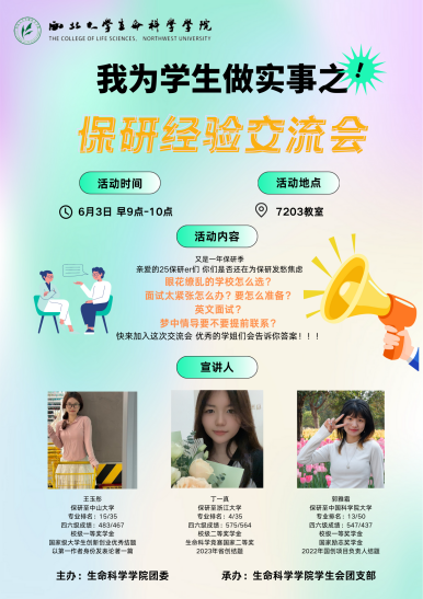 为持续加强学风建设,引导学生进一步明确学业规划和发展方向,更好的掌握保研技巧和拟推免院校信息,发挥先进典型的示范引领作用,营造良好学习风气和浓郁学习氛围, 6月3日,我院在太白校区7203教室成功举办保研经验交流会。活动由范铭沁老师主持,邀请了3位来自2020级的优秀毕业生代表进行经验分享,学院40余名同学参加。