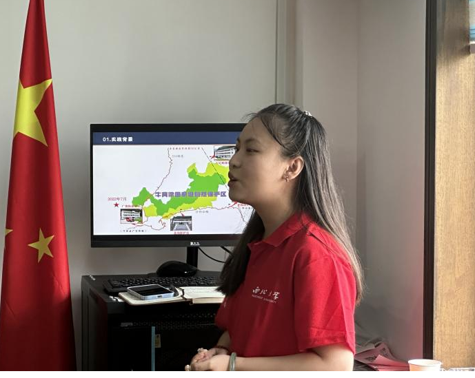 随后,马佳雨代表学院“绿脉筑梦,秦岭先锋”实践队,汇报了他们在牛背梁国家自然保护区进行的生物多样性调研、土壤含碳量测量及碳中和联合创新平台走访等实践活动经验及成果。这些实践活动不仅为管理局的科研工作提供了宝贵的数据支持,也进一步提升了队员们对专业实践重要性的认识和生态保护的责任感。