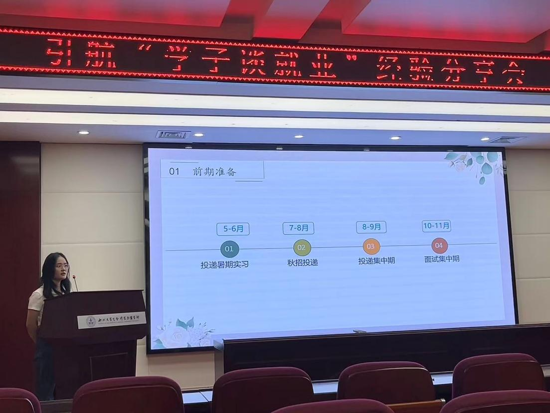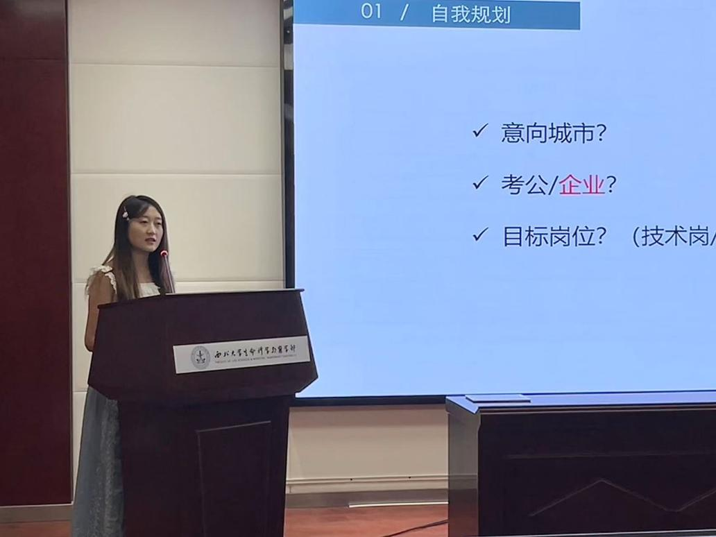 分享会伊始,张芝榕介绍了当前就业的严峻形势,强调了提前规划与积极行动的重要性。她指出,面对日益激烈的竞争环境,同学们需要全方位提升自身能力,精准定位职业目标,才能在就业市场中脱颖而出。