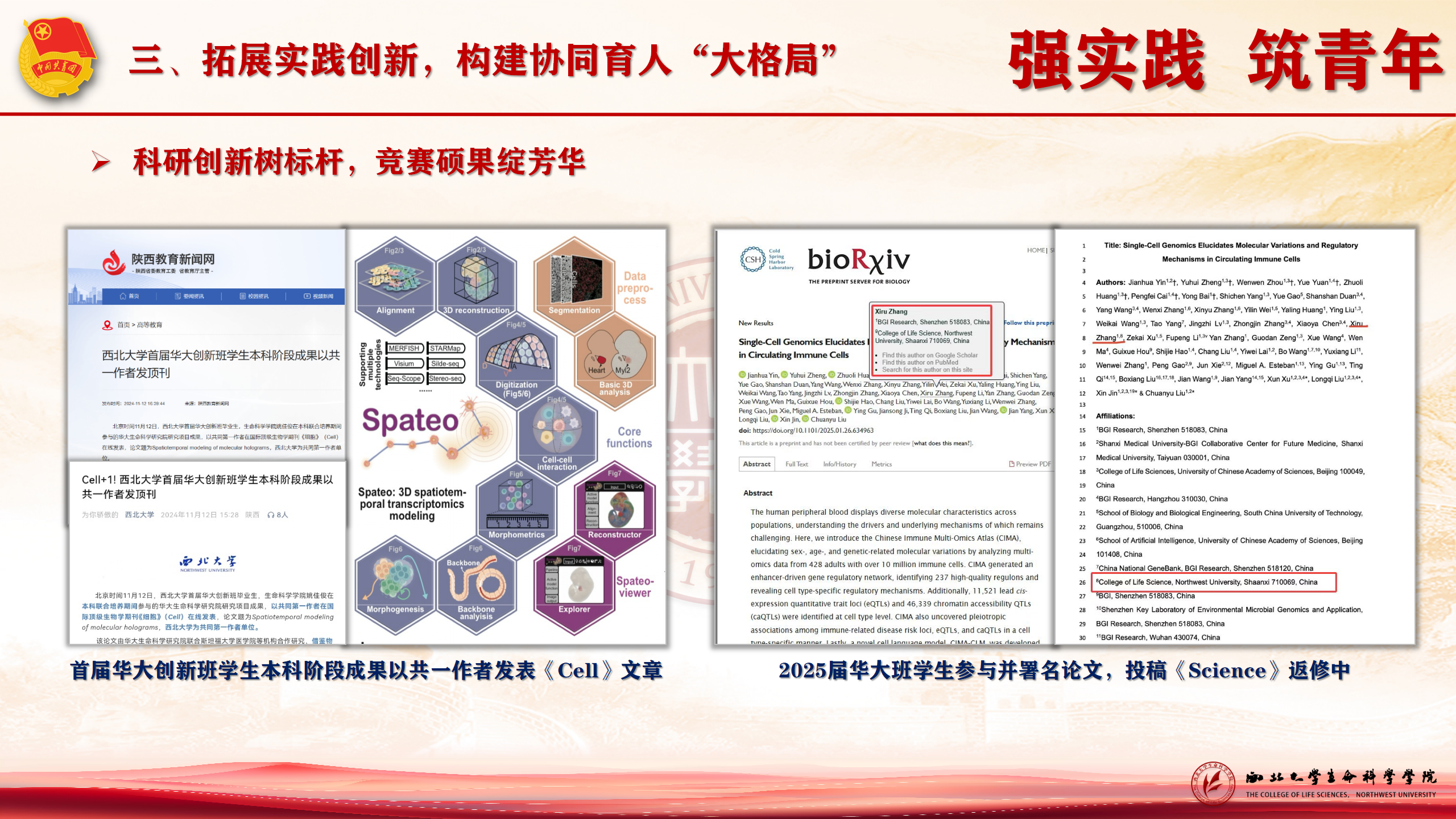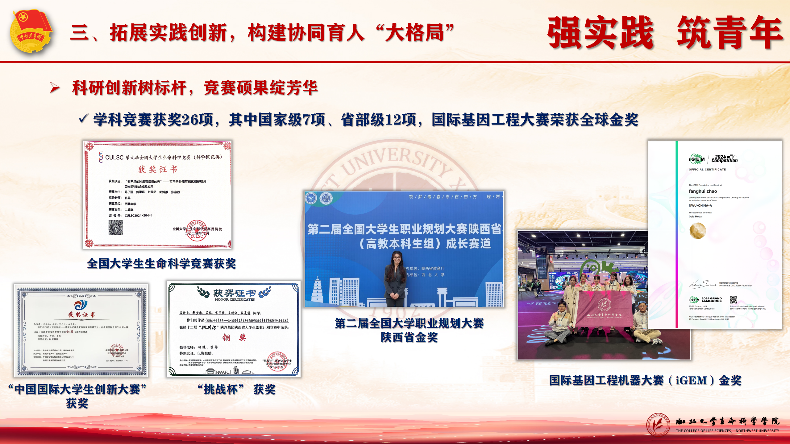 通过组织参加国际iGEM大赛、合成生物学竞赛、挑战杯等专业竞赛,提升并展现团员青年扎实的专业技能和创新能力,学生学科竞赛获奖26项,其中国际基因工程大赛荣获全球金奖,国家级7项、省部级12项;首届华大班毕业生以共同第一作者在《Cell》发表高水平论文。2021级华大班学生参与并署名论文正在进行《science》返修。