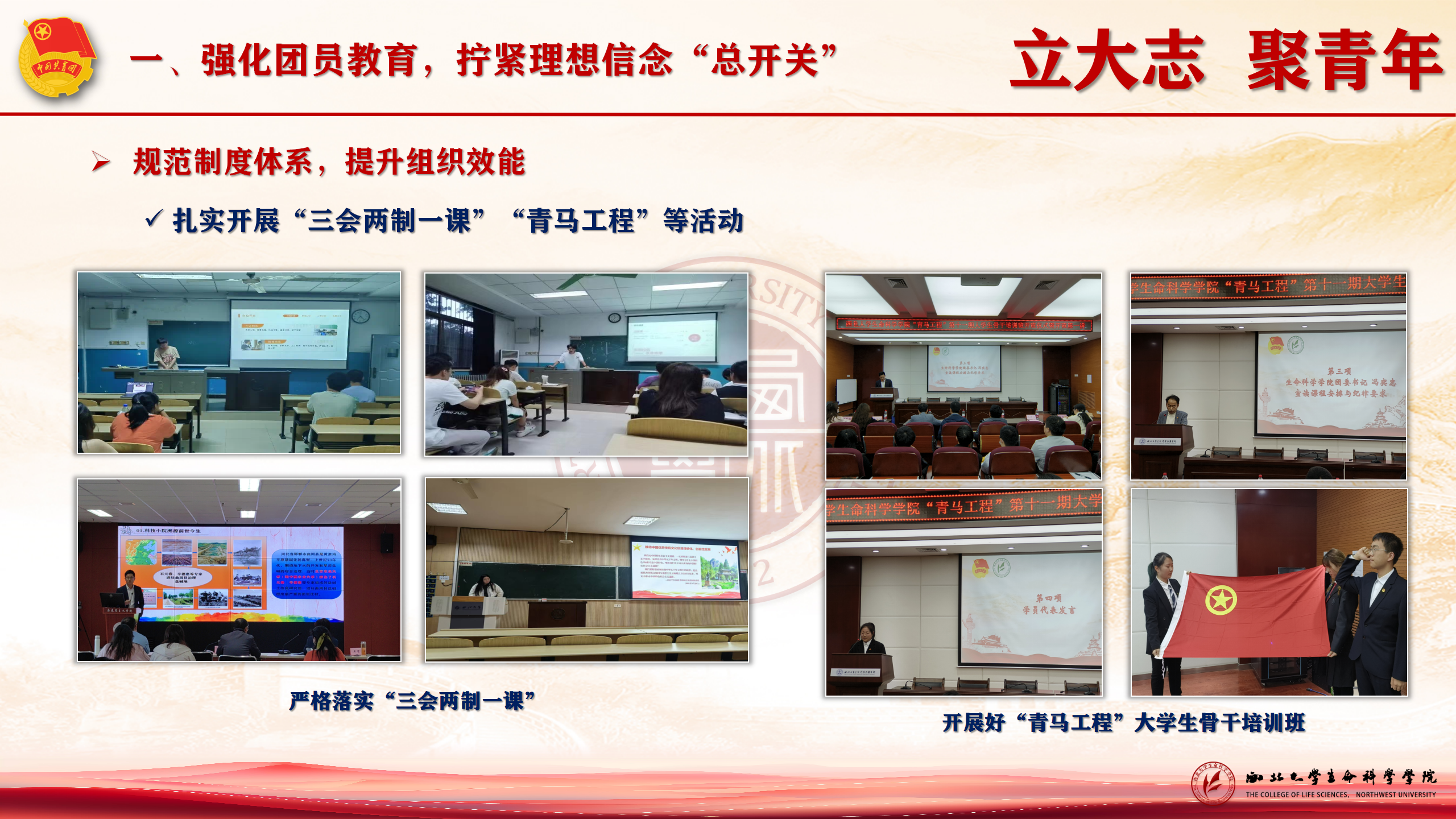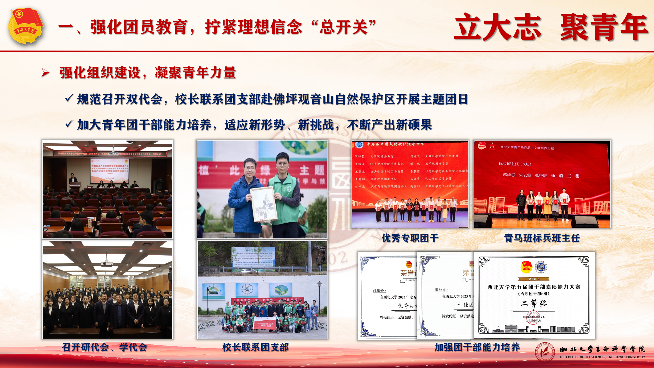 强化组织建设,凝聚青年力量。充分发挥组织育人功能,坚定理想信念。深化团组织改革,规范召开双代会,“智慧团建”运行精准高效。校长联系团支部赴佛坪观音山自然保护区开展生态保护主题团日,亮点纷呈,成效显著。加大青年团干部能力培养,适应新形势、新挑战,不断产出新硕果,为团员青年成长提供坚实的组织保障。