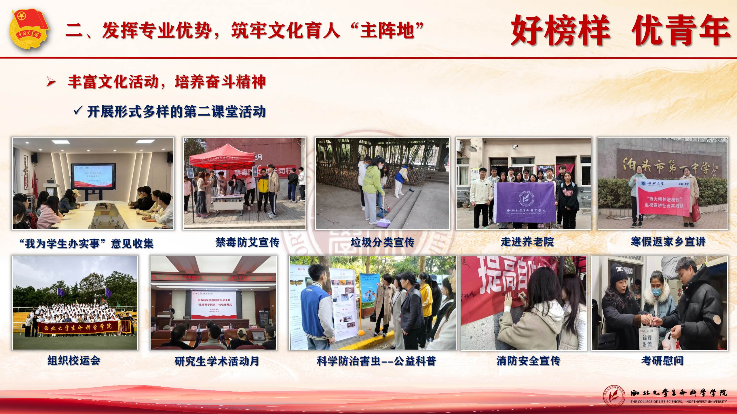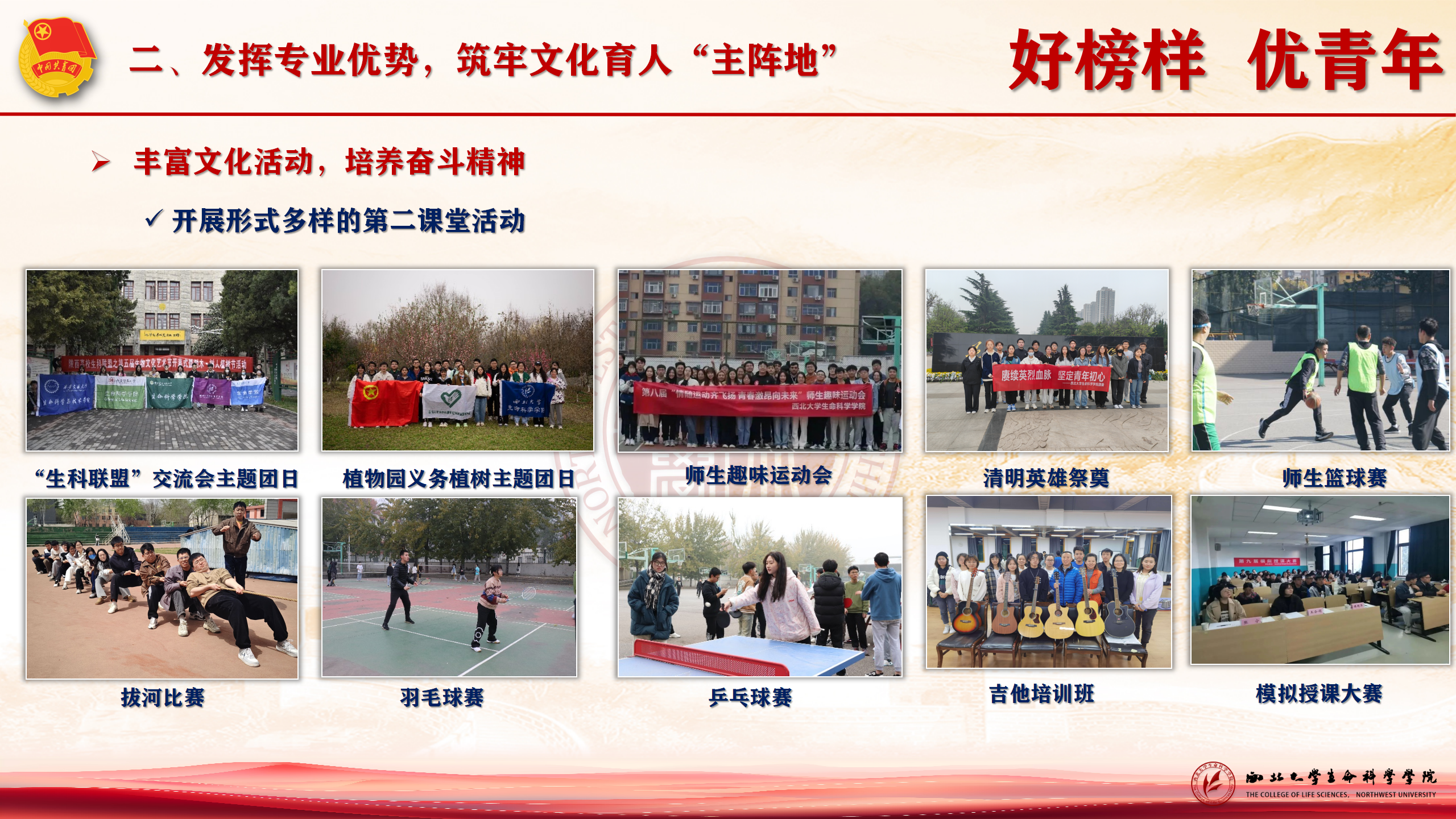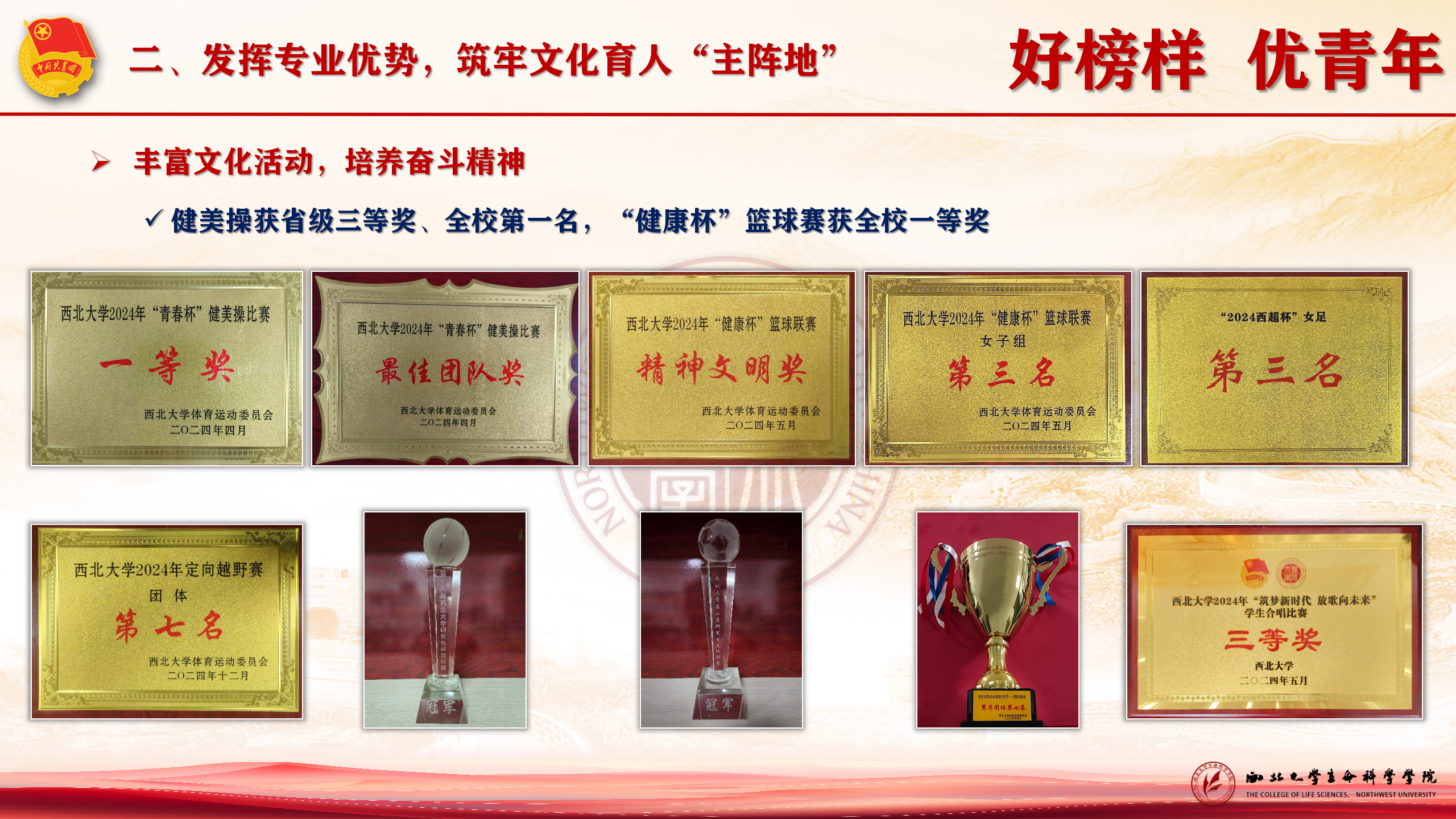 丰富文化活动,培养奋斗精神。学院健美操队荣获省级三等奖、校级第一名,“健康杯”篮球赛获校总冠军。陕西高校“生科联盟”团学组织交流会、师生运动会、模拟授课等活动,全面提升学生综合素质,为团员青年的成长成才提供了广阔的舞台。