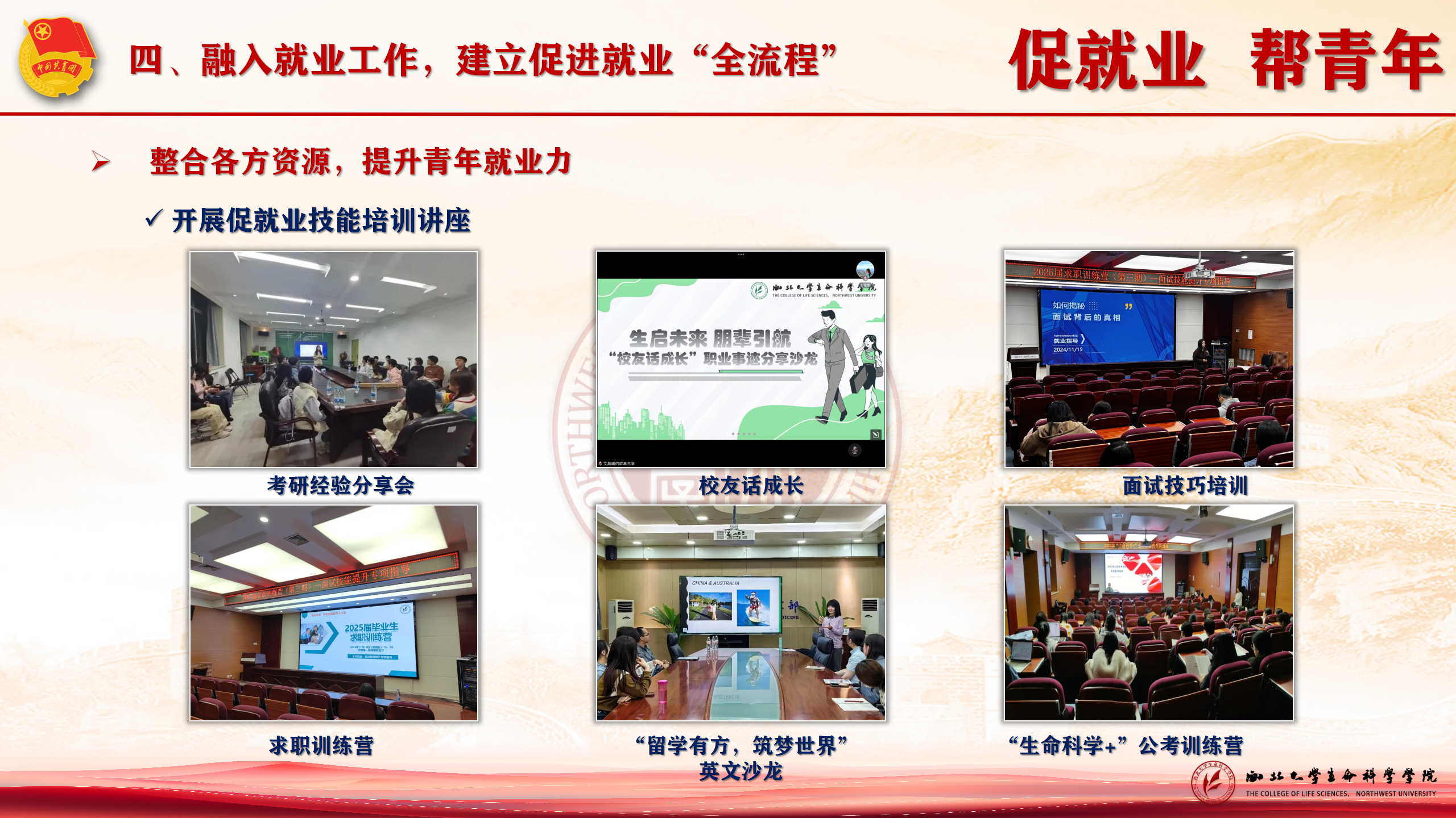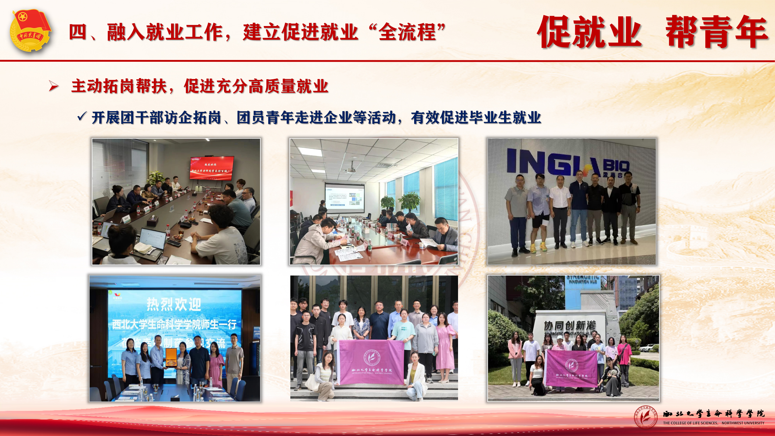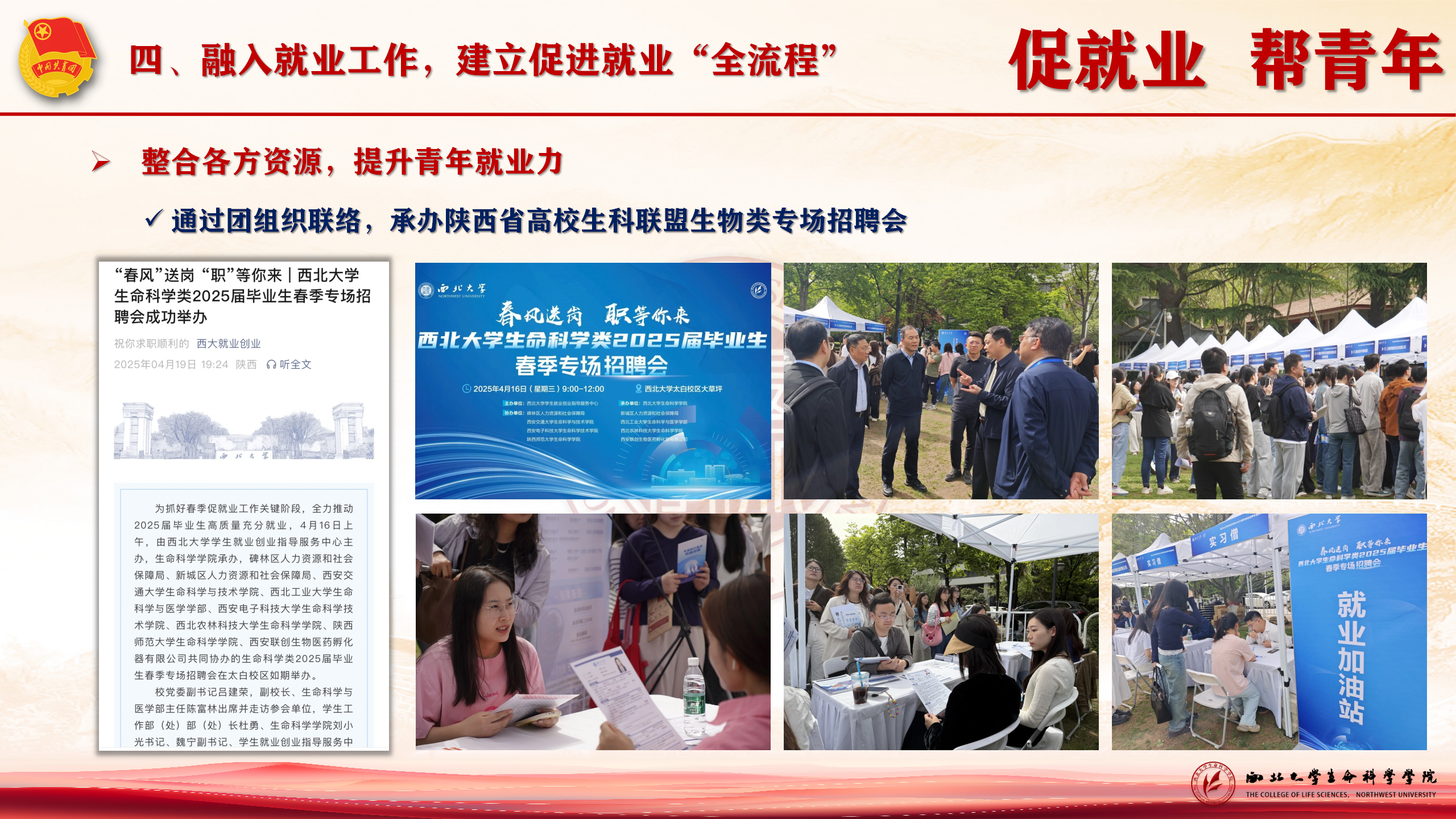 促就业,帮青年。整合资源,通过联盟团委举办陕西高校生物类专场招聘会;加强政策宣传和就业指导帮扶,全面提升团员青年就业力。通过青马班、团课融入国家发展需求,强化职业价值观教育。