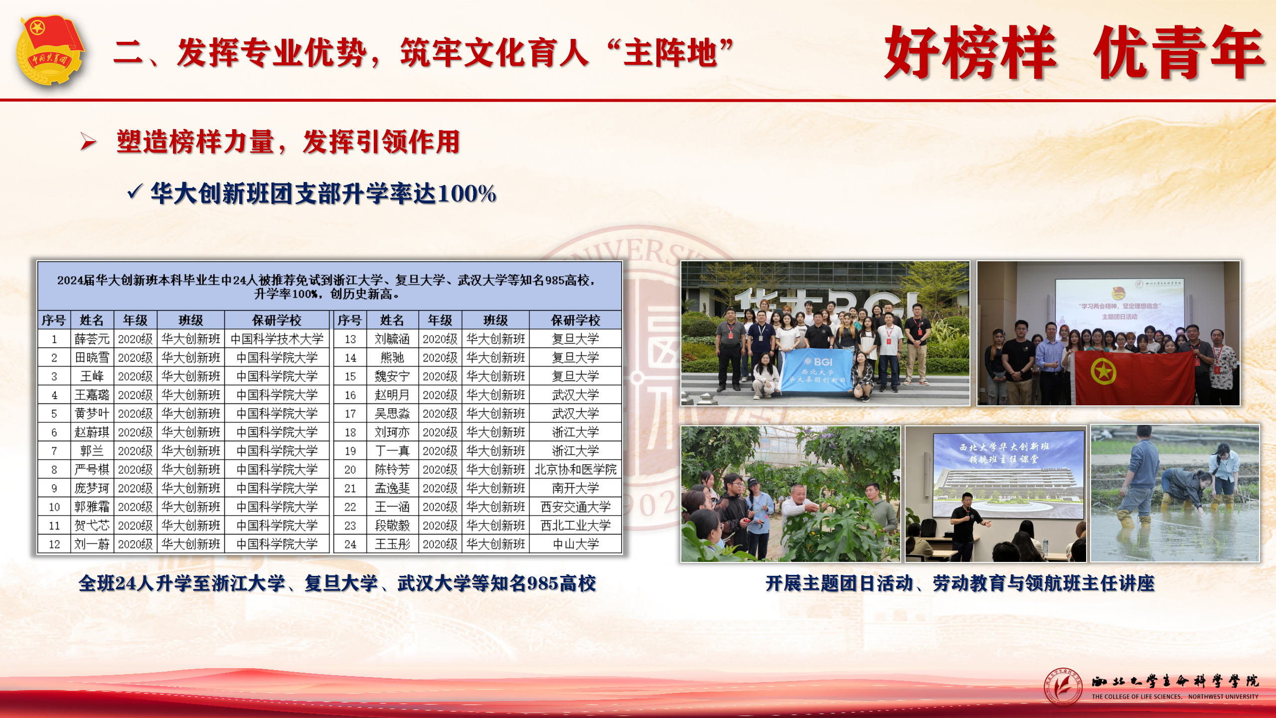 4.2023级生物科学(基地班)专业本科团支部、2023级生科科学与技术(基地班)专业本科团支部等7个团支部获评“三星级团支部”。