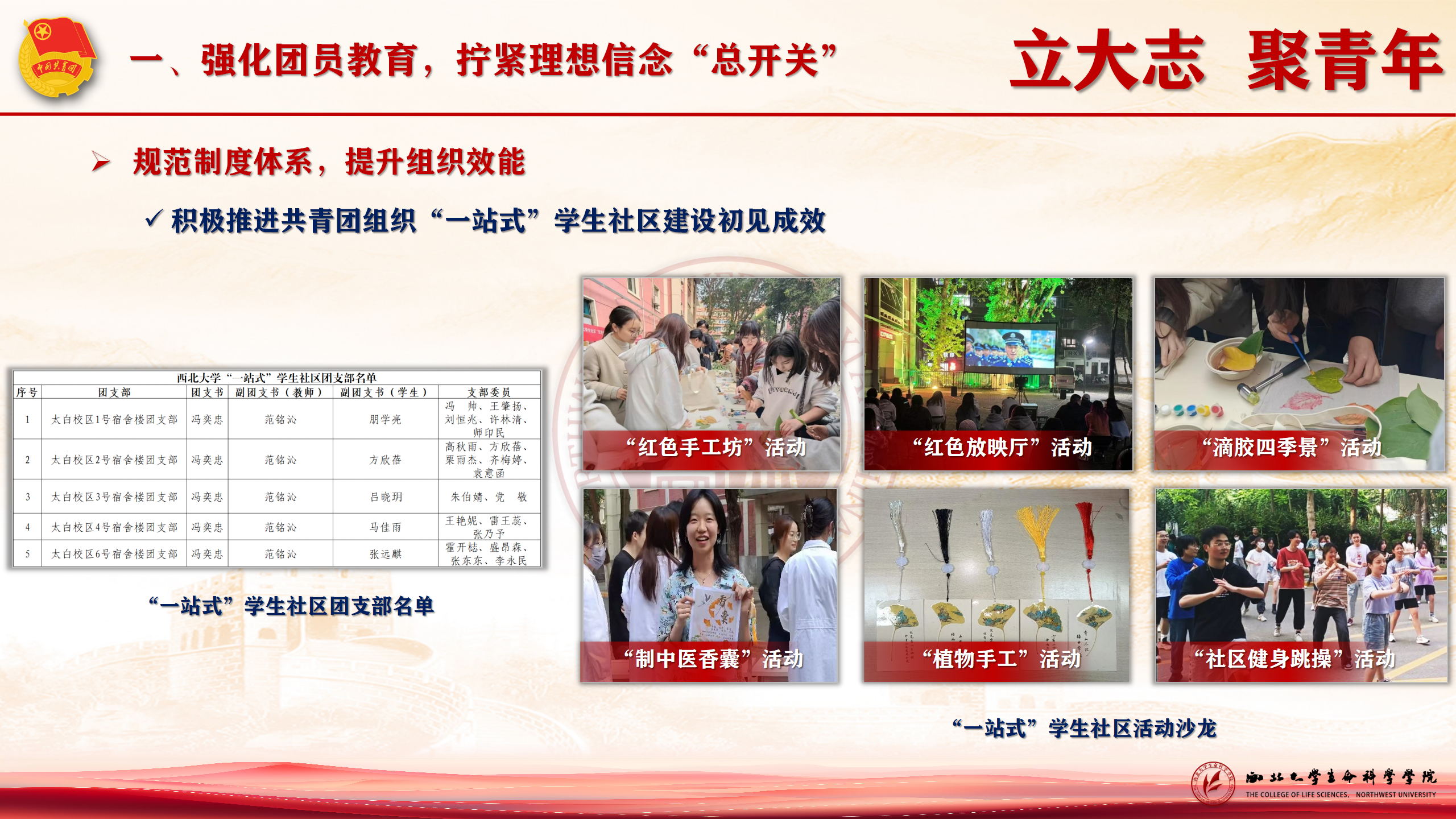 规范制度体系,提升组织效能。始终坚持党建引领,不断深化“三力”建设,“推优”入党比例100%,从严治团,确保团组织政治性和先进性。扎实开展“三会两制一课”“青马工程”等活动,推进共青团组织“一站式”学生社区建设,开展了“筑梦榜样说”“红色手工坊”“红色放映厅”“筑梦直播间”“红色科普课堂”等活动沙龙,功能性团支部育人成效已逐渐显现。
