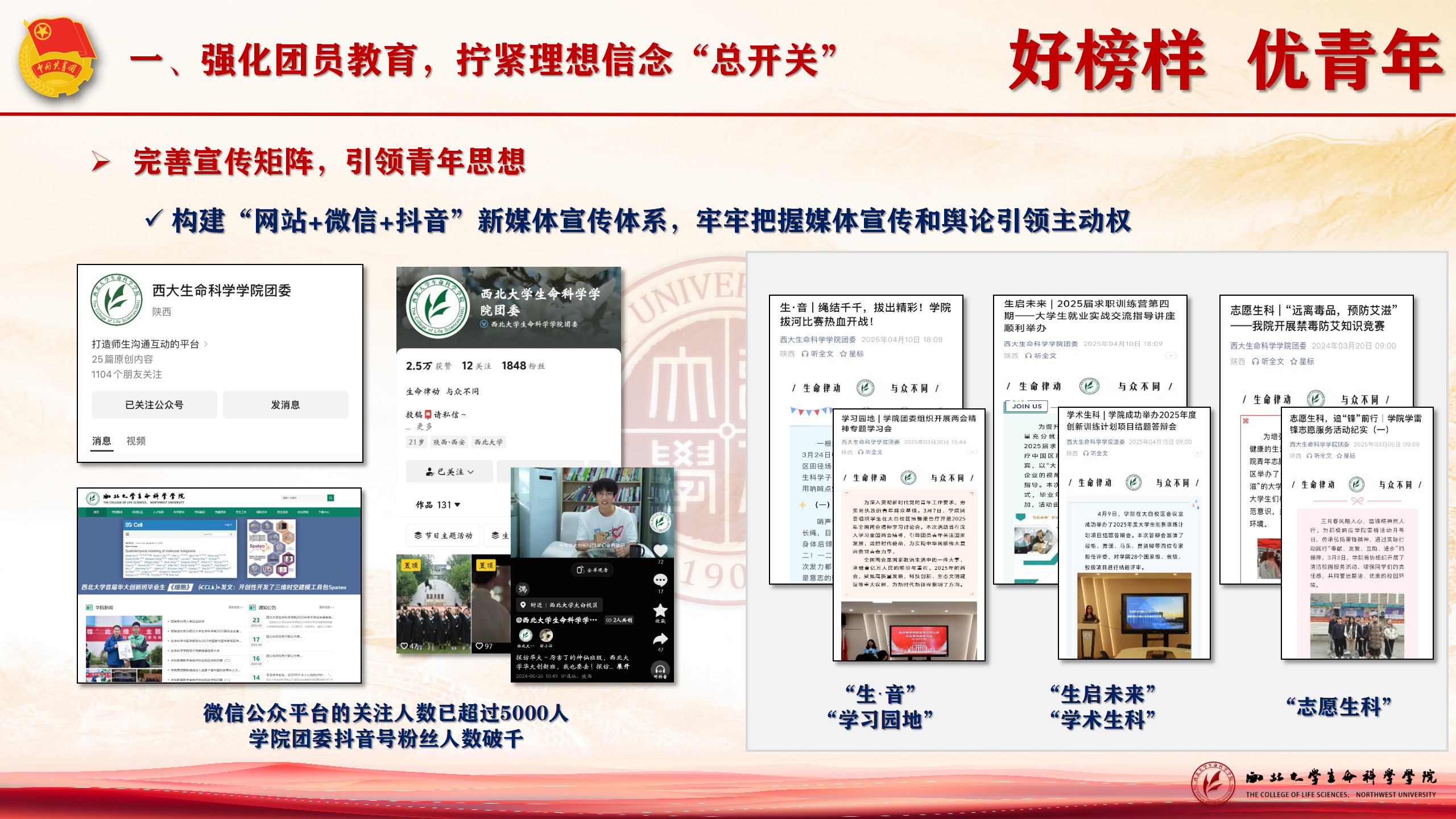 完善宣传矩阵,引领青年思想。构建新媒体矩阵,牢牢占领媒体宣传和舆论引领主阵地。“生·音”“小团聚焦”“权益半月刊”等栏目,为团员青年提供随时学习、方便学习的渠道。