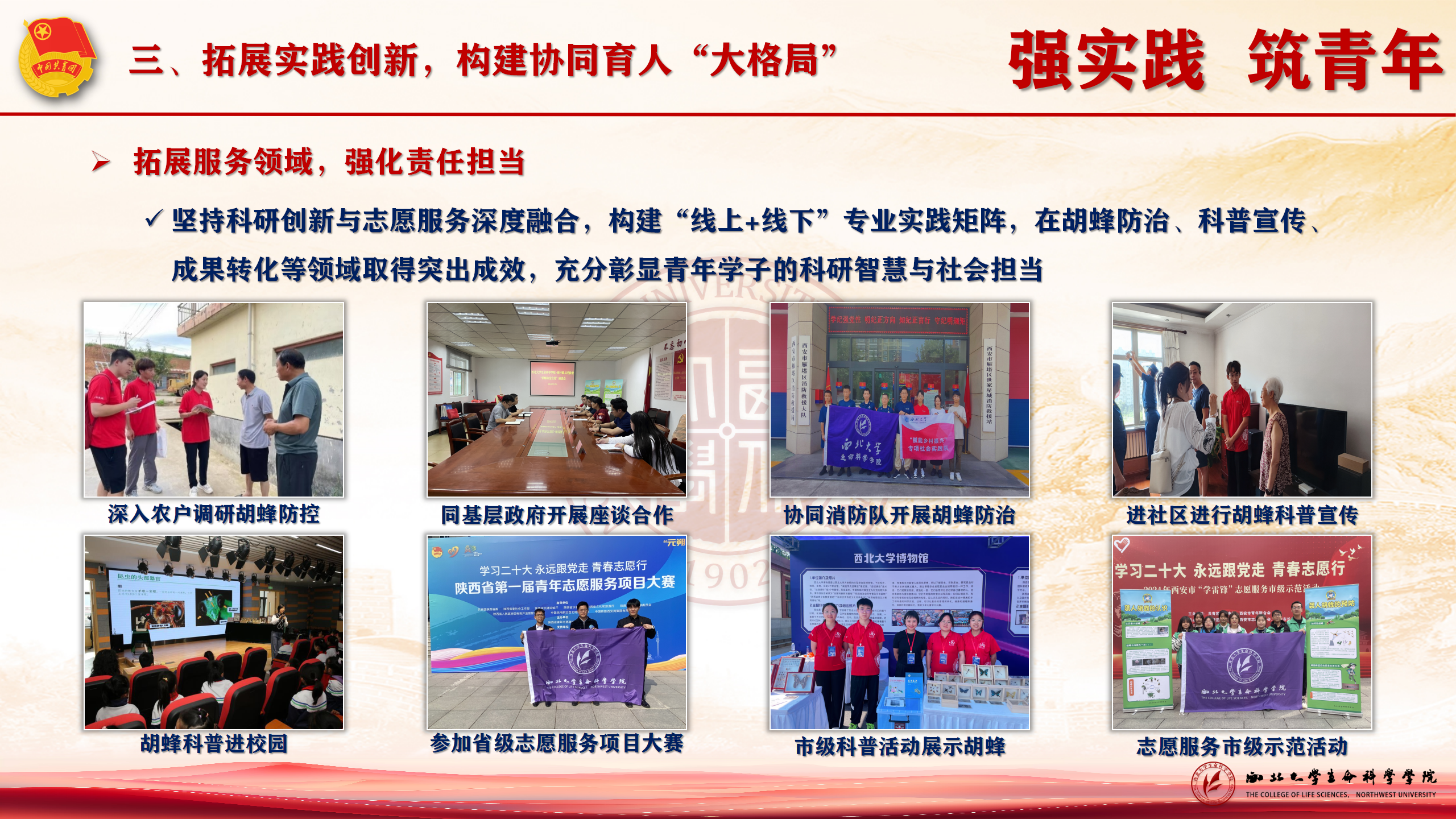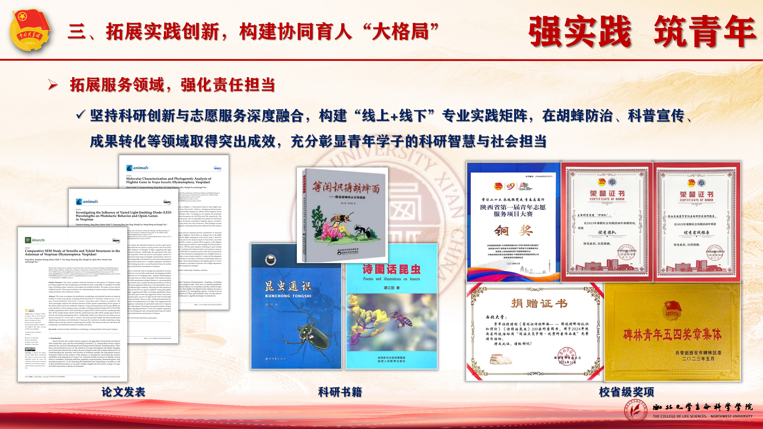 强实践,筑青年。品牌队伍“冲锋队”,就是我们胡蜂社会实践科研团队,多年来,始终坚持科研创新、实践与志愿服务深度融合,构建“线上+线下”专业实践矩阵,在胡蜂防治、科普宣传、成果转化等领域取得突出成效,屡创佳绩。又新荣获陕西省志愿服务大赛铜奖,新产出SCI论文在投1篇,充分彰显青年学子的科研智慧与社会担当。