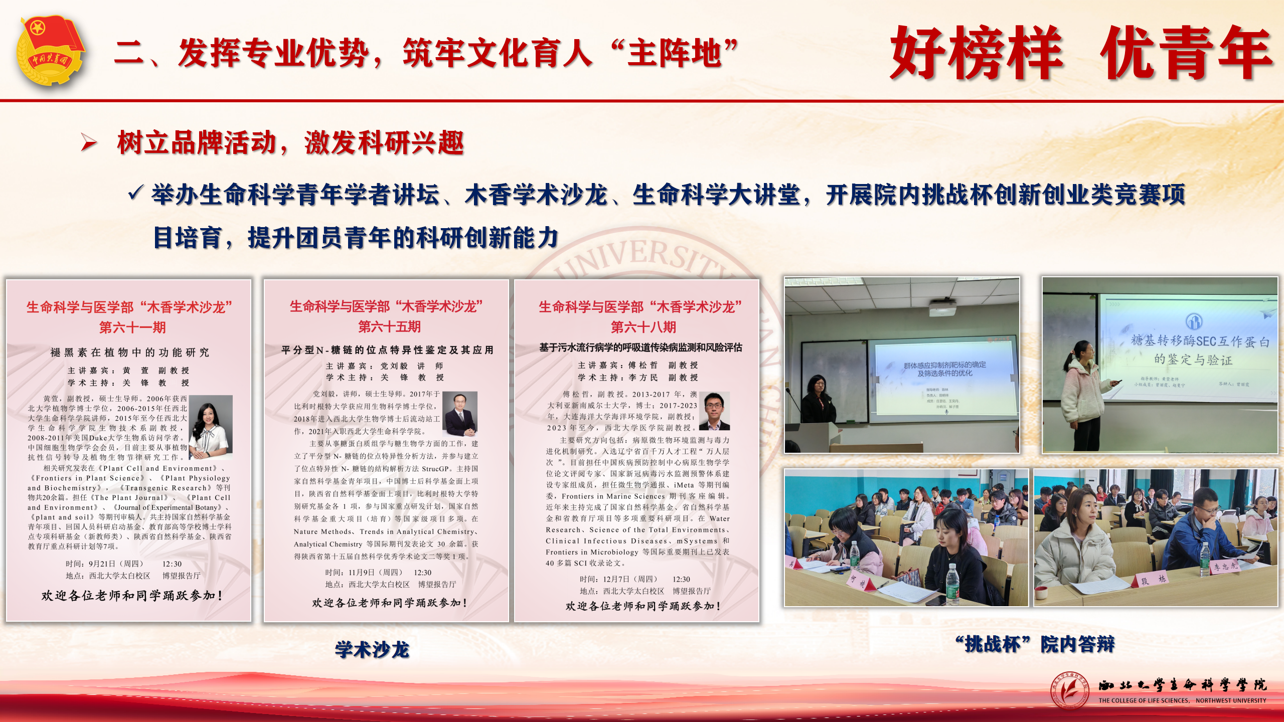 树立品牌活动,激发科研兴趣。举办“木香学术沙龙”“生命科学大讲堂”等品牌活动30场,参与人次超700,进一步激发团员青年的科研兴趣,提升科研创新能力和专业自信。